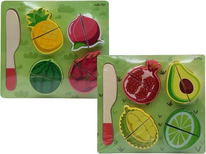 Puoi scegliere tra due varianti di frutta. I singoli pezzi restano saldamente uniti, ma si separano facilmente con il coltello di legno, offrendo un’esperienza realistica di “taglio” senza rischio di ferite. Perfetto per la casa, l’asilo o come regalo.