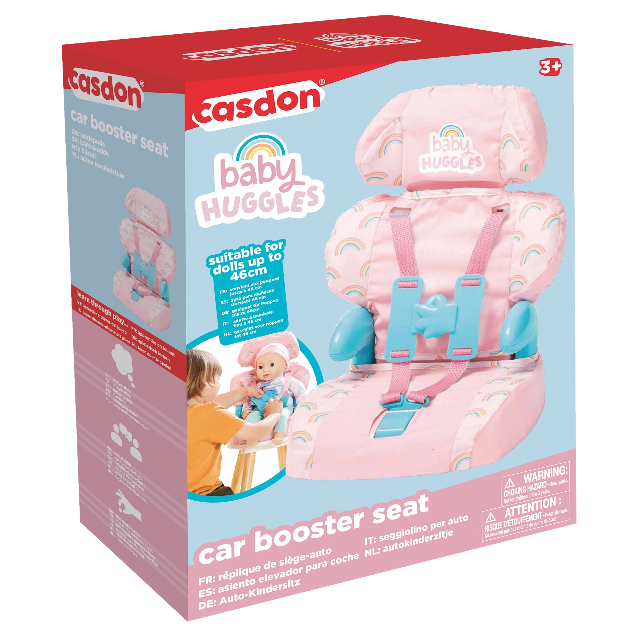 Offri ai bambini un gioco realistico con il seggiolino auto per bambole BABY HUGGLES del marchio CASDON. Il seggiolino dal design rosa-arcobaleno ha una morbida imbottitura, comodi braccioli e cinghie regolabili con una fibbia semplice, così la bambola rimane saldamente allacciata. Grazie alla struttura leggera e stabile, è facile da trasportare e usare sia in casa che in viaggio.