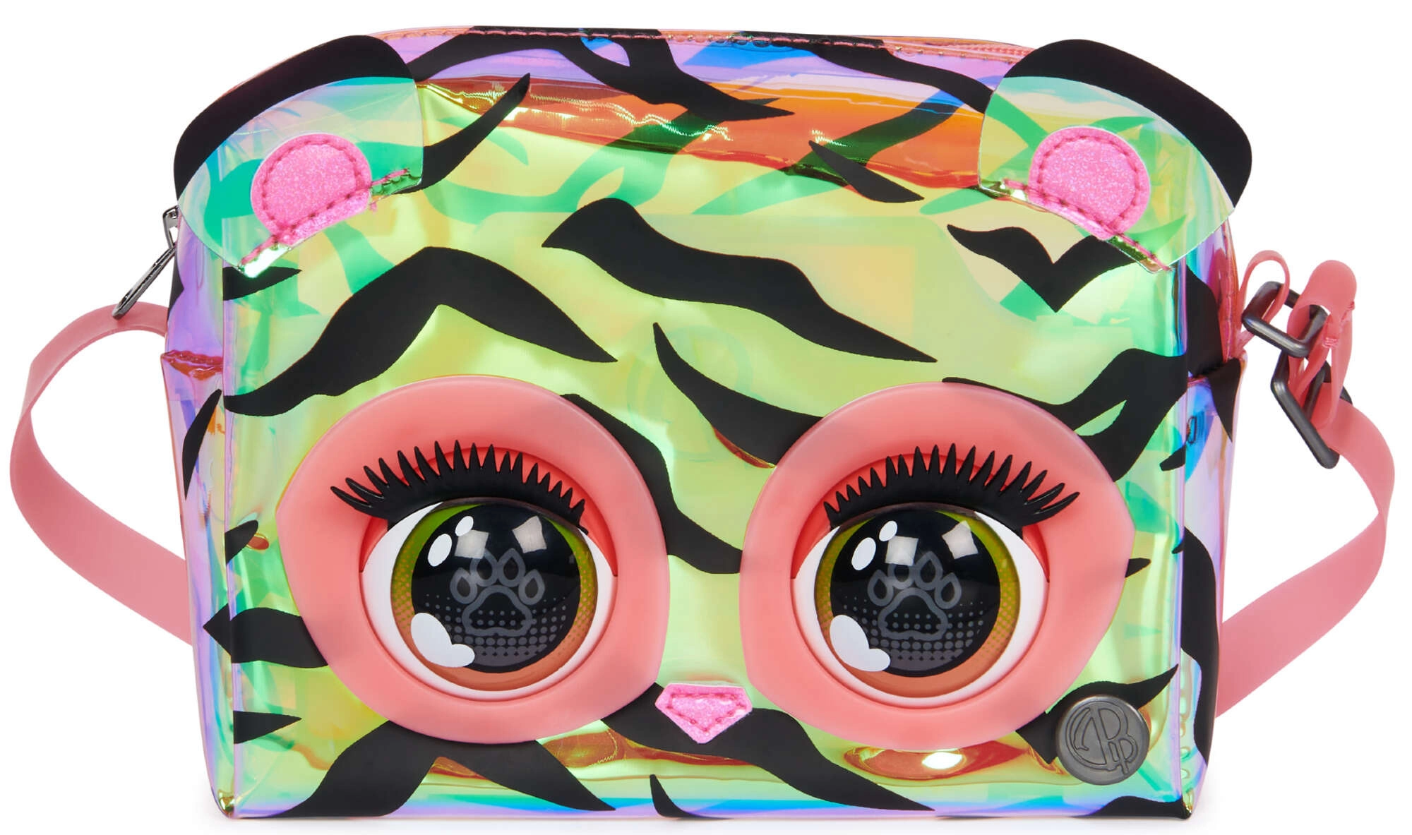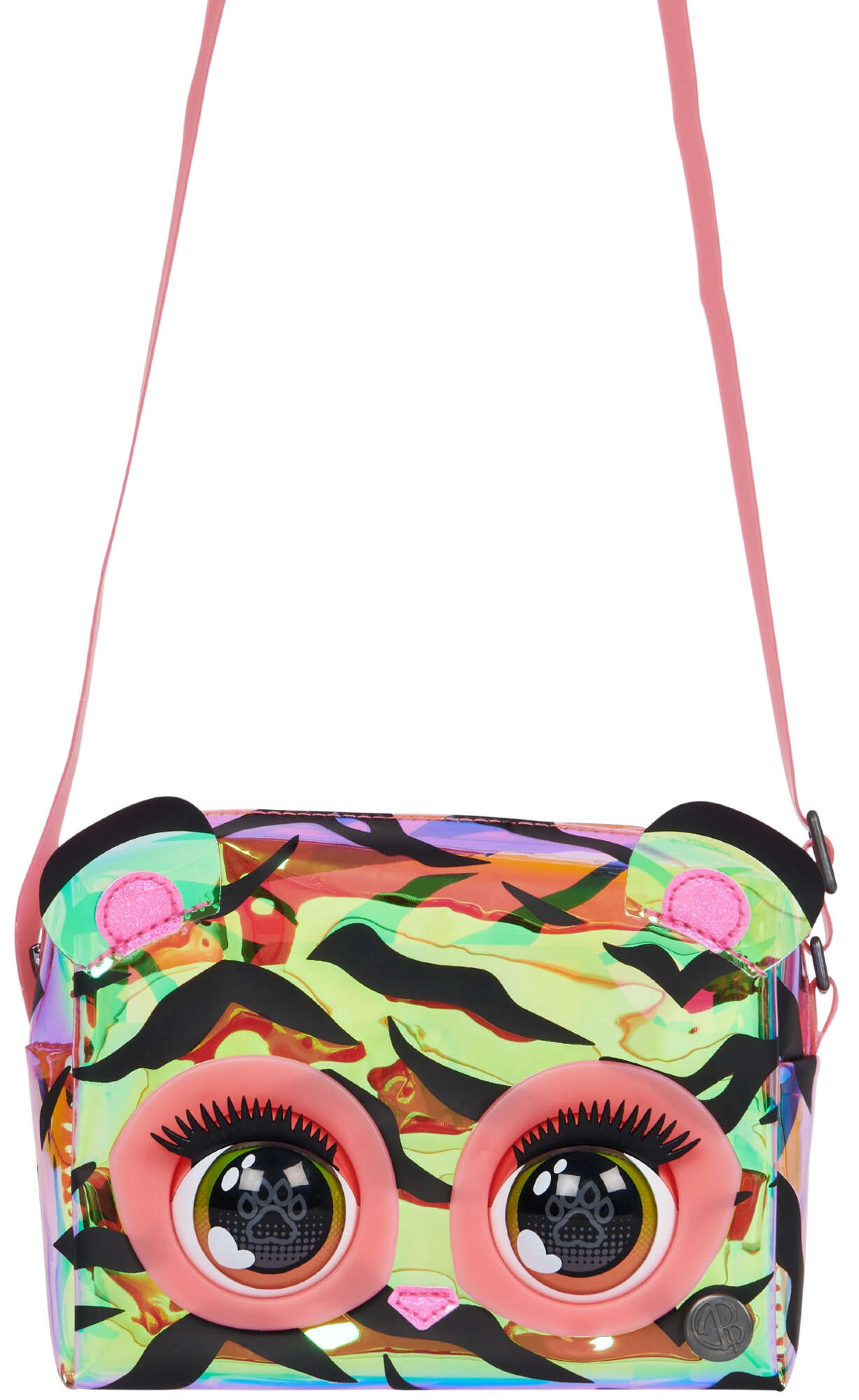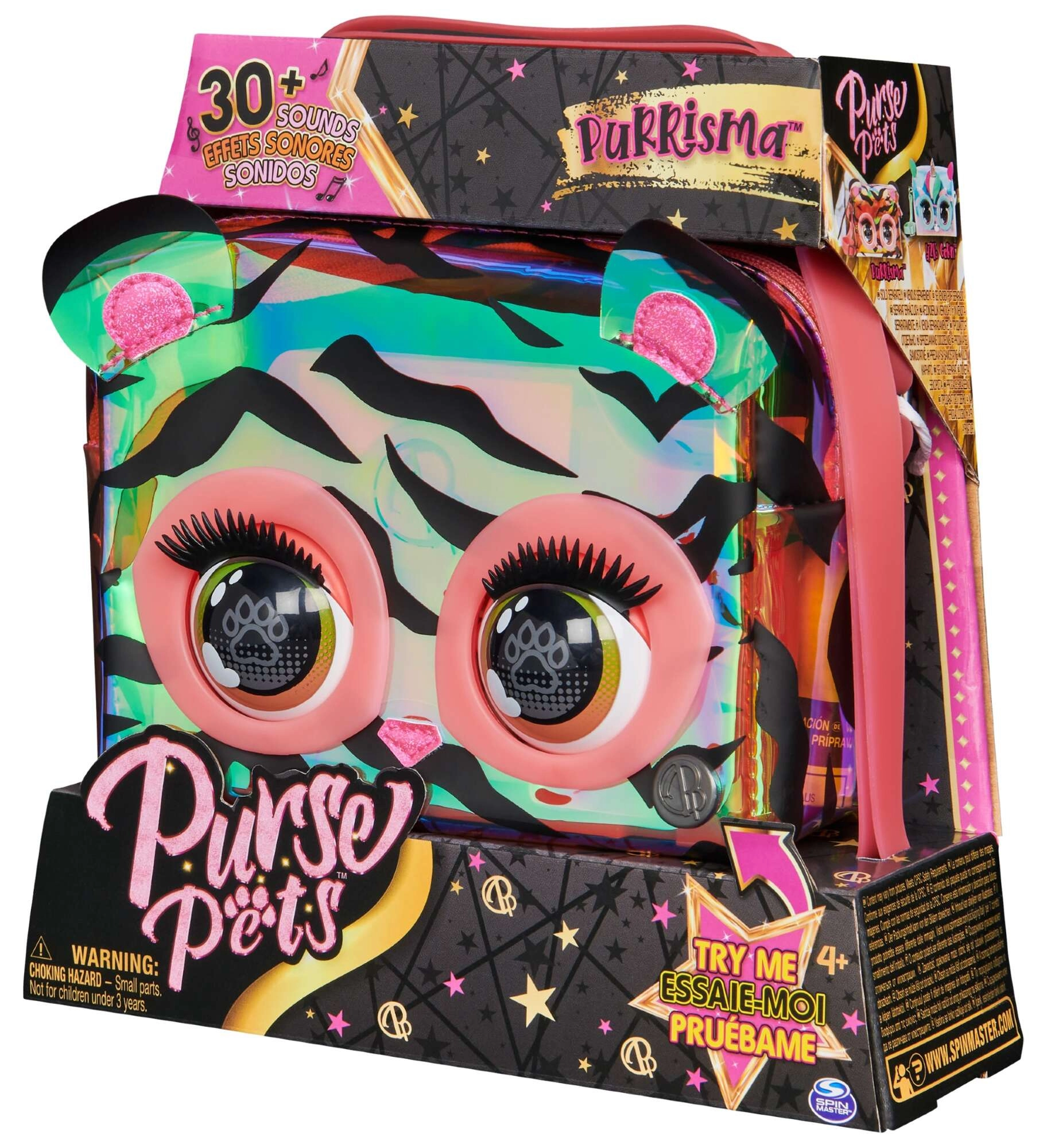Scopri la magica borsetta Purse Pets Purrisma del marchio Spin Master, che conquisterà il cuore di ogni piccola fashionista. Il corpo della borsa ricorda un tenero animaletto con superficie olografica arcobaleno, strisce nere e orecchie colorate. Premendo il pulsante, la borsetta emette suoni divertenti e i suoi occhi si aprono e si chiudono, risultando vivace e giocosa.