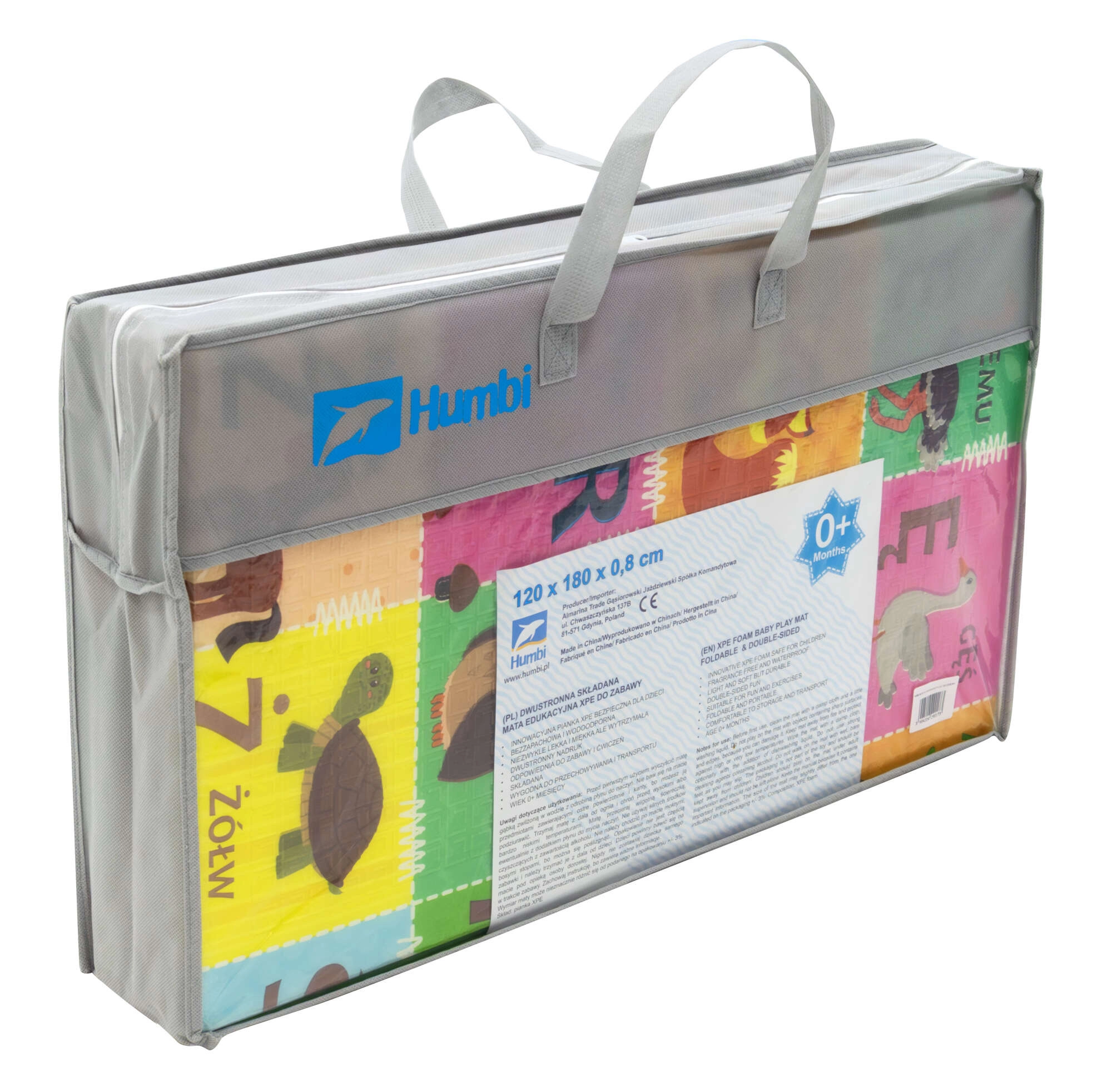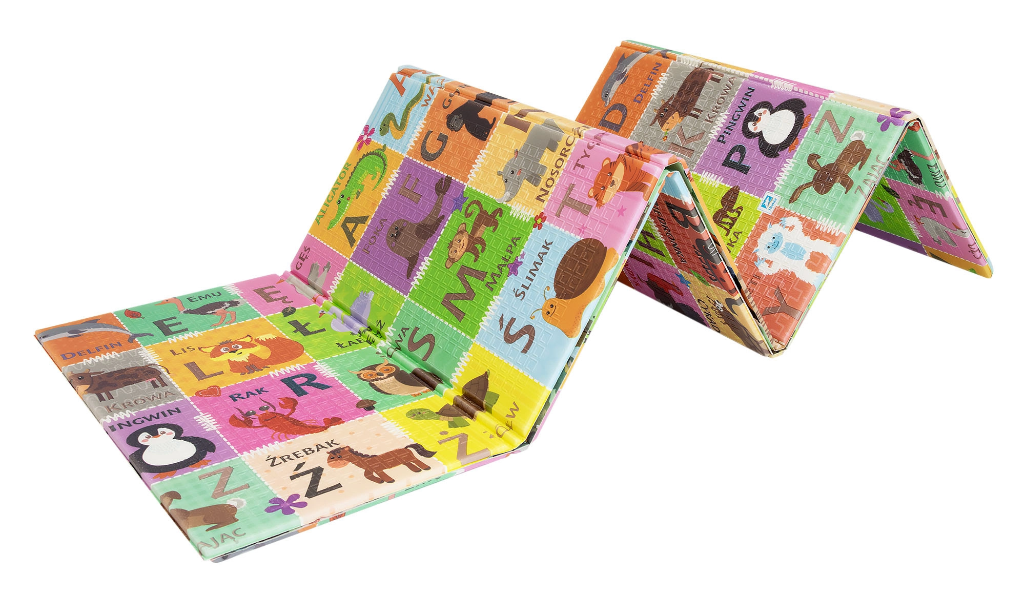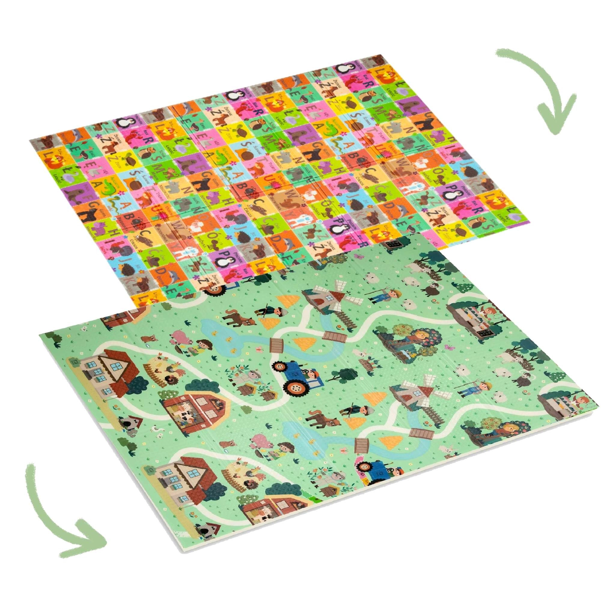 Il design bifacciale stimola apprendimento e creatività: un lato con alfabeto colorato e animaletti favorisce il riconoscimento delle lettere, l’altro con villaggio, casette e strade invita al gioco di fantasia. Il tappetino è antiscivolo, impermeabile e igienico: basta passarlo con un panno umido. Grazie alla struttura pieghevole si ripiega rapidamente, si ripone con facilità e con la borsa con manico inclusa si trasporta comodamente.