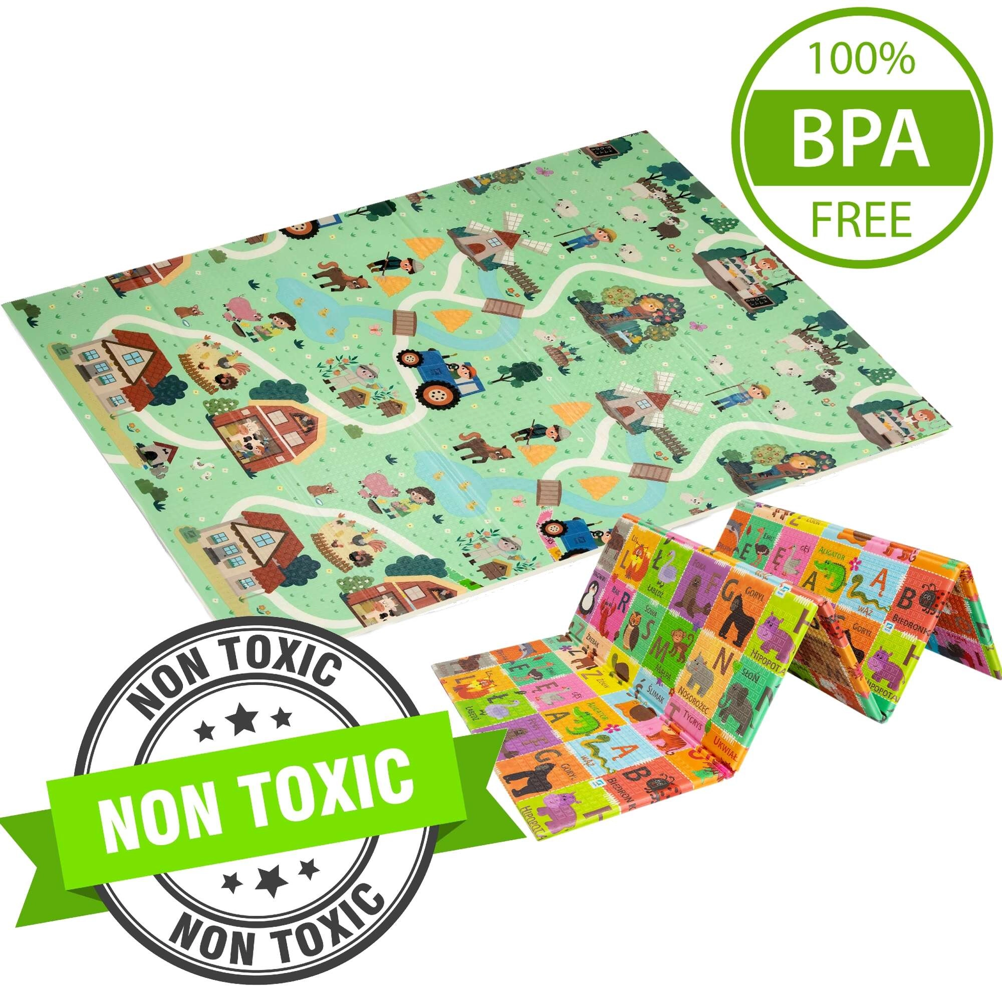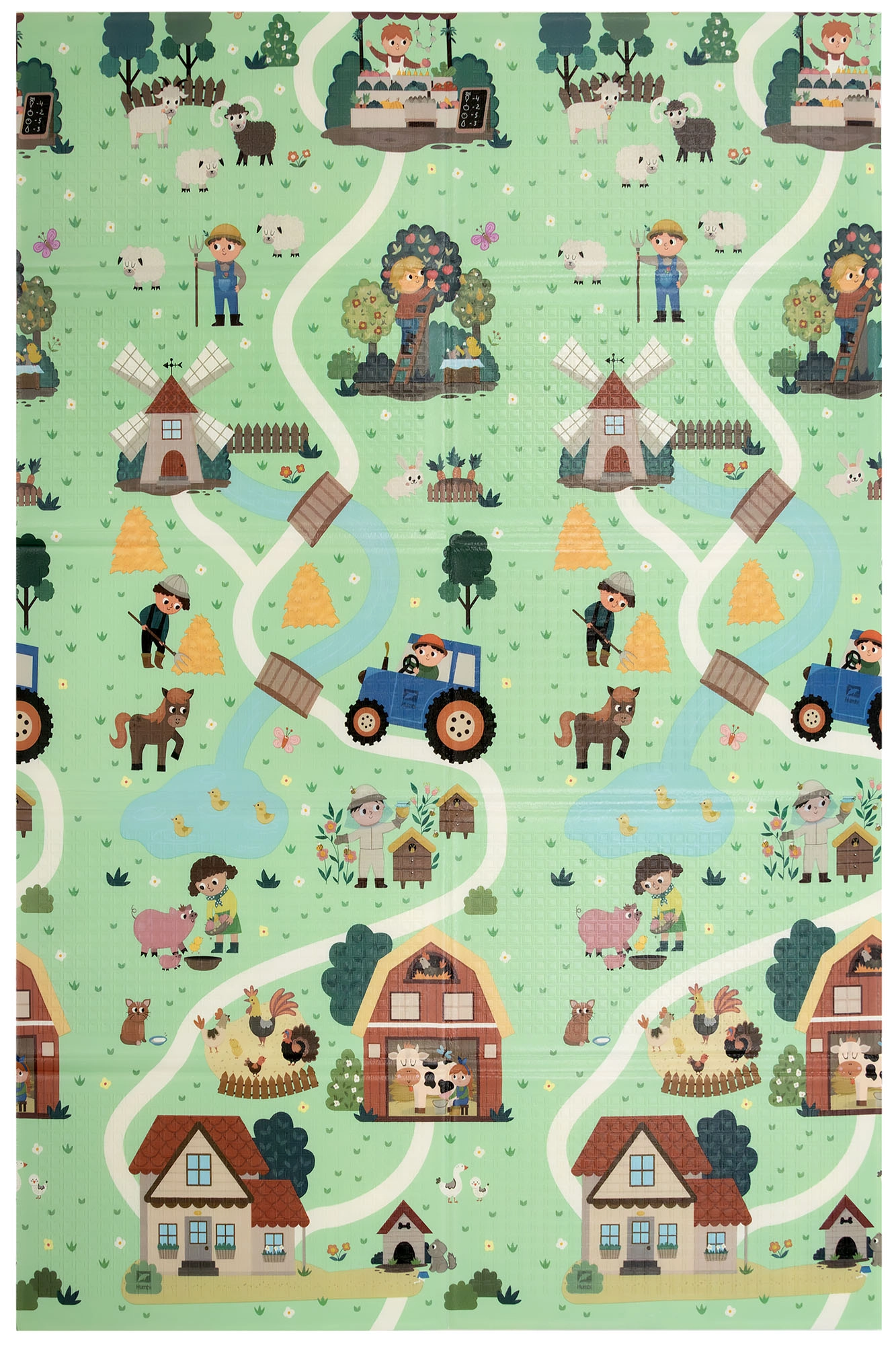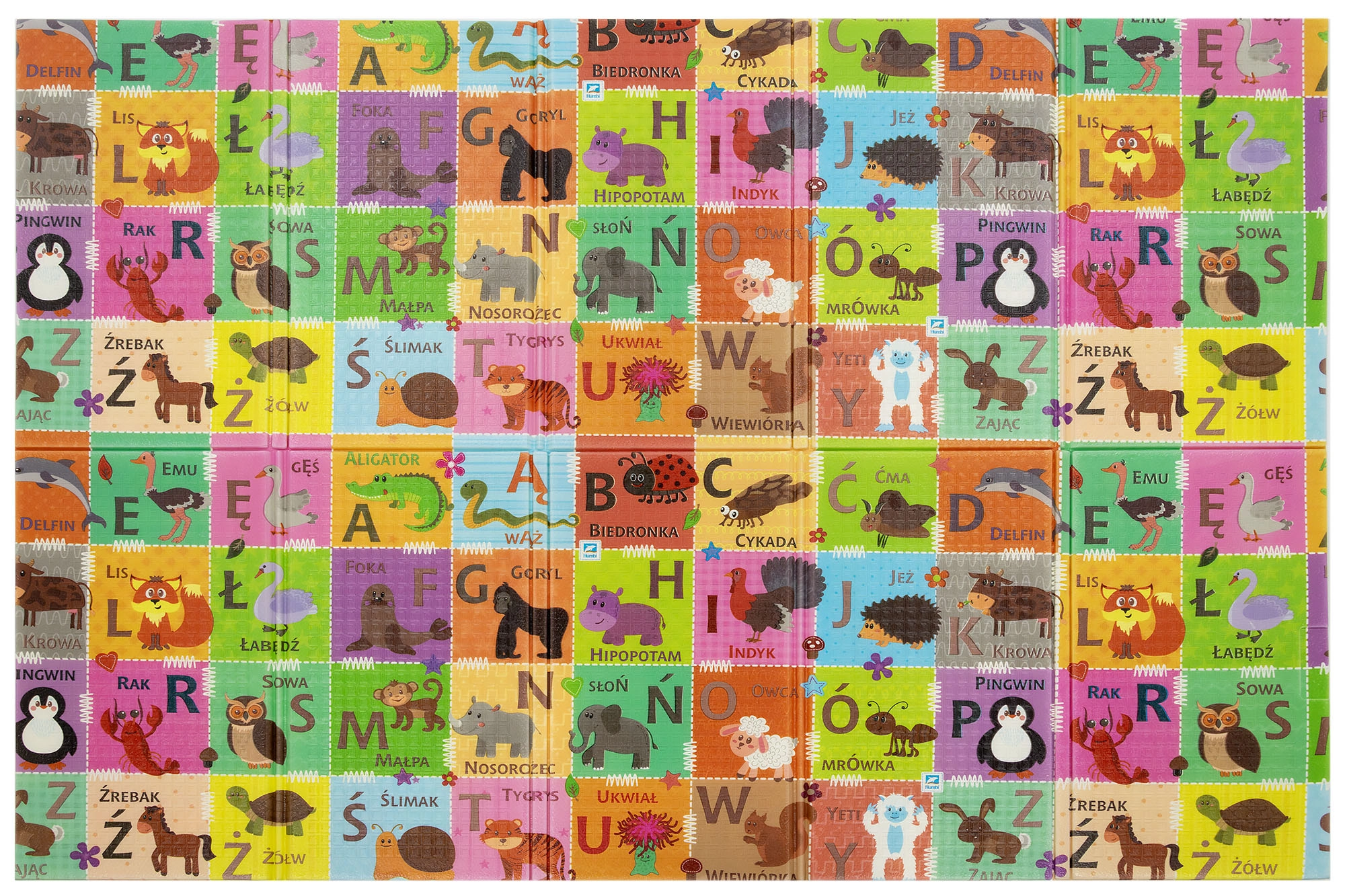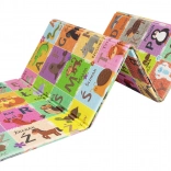 Il design bifacciale stimola apprendimento e creatività: un lato con alfabeto colorato e animaletti favorisce il riconoscimento delle lettere, l’altro con villaggio, casette e strade invita al gioco di fantasia. Il tappetino è antiscivolo, impermeabile e igienico: basta passarlo con un panno umido. Grazie alla struttura pieghevole si ripiega rapidamente, si ripone con facilità e con la borsa con manico inclusa si trasporta comodamente.