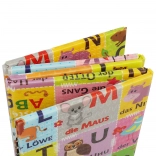 Un lato con un allegro alfabeto e animaletti, l’altro con una cittadina illustrata e strade. Il bambino allena le lettere e la fantasia guidando le macchinine.