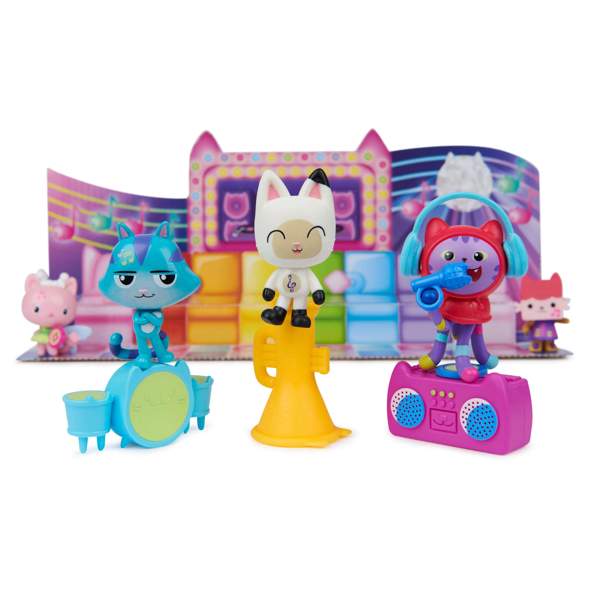 Include lo sfondo pieghevole del palco, le figurine dei protagonisti, batteria, tromba, boombox, microfoni e altri oggetti di scena. Non manca una sorpresa in una dolce scatolina che dà nuovo slancio al gioco. Il set è ideale per il gioco indipendente o come complemento ad altre casette e set di GABBY'S DOLLHOUSE.