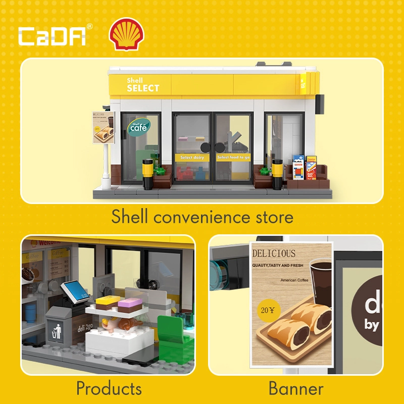Il set CaDA propone un mini negozio SHELL a un piano ricco di dettagli realistici, come porte scorrevoli/apribili, vetrine, poster e arredi interni. Ideale per bambini dagli 8 anni e per adulti appassionati di costruzioni che amano precisione e modelli da display eleganti.