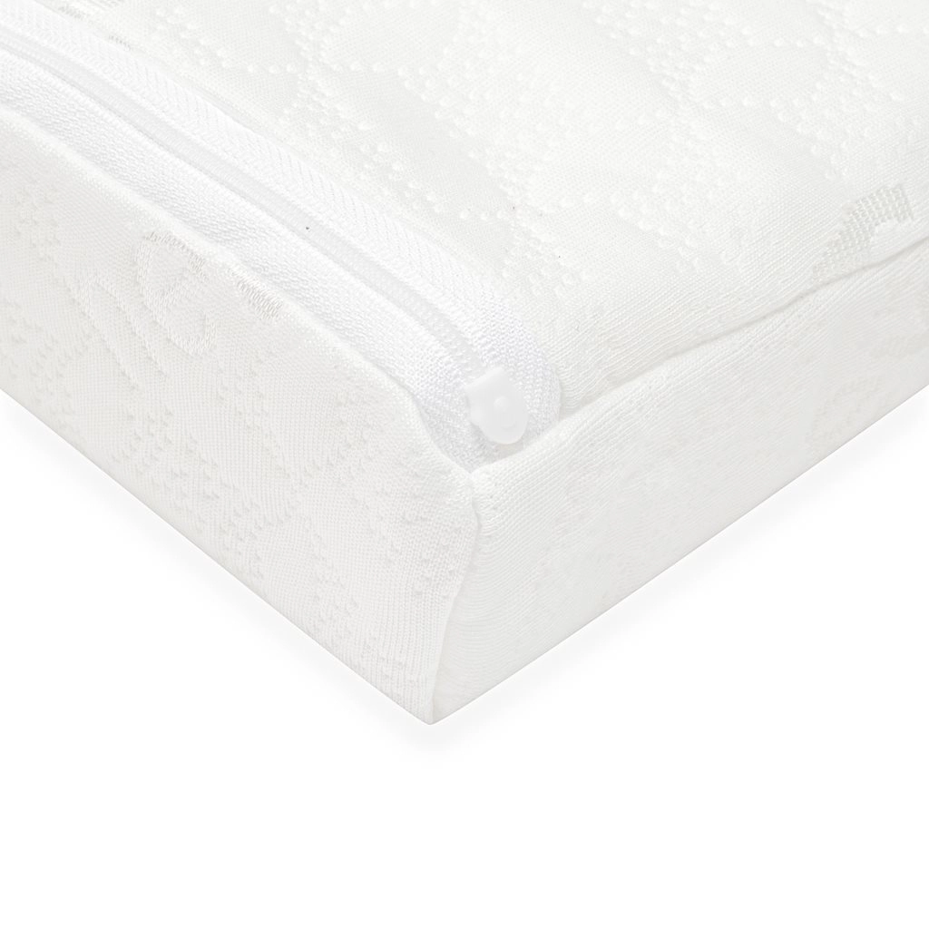 La fodera rimovibile in 100% poliestere è morbida, traspirante e antiallergica. L’imbottitura in schiuma poliuretanica di qualità offre un supporto stabile, rimanendo piacevolmente morbida. Le dimensioni 59 × 37 cm con altezza di circa 7 cm nel punto più alto si adattano alla maggior parte dei lettini per bambini.