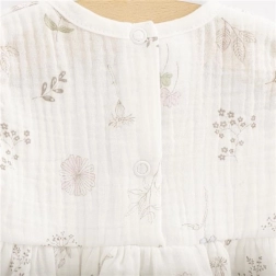 La mussola in cotone 100% è non solo eccezionalmente confortevole, ma anche resistente: a ogni lavaggio diventa ancora più morbida mantenendo la sua forma. La chiusura a pressione sul retro rende i cambi d'abito rapidissimi, perfetta per l'uso quotidiano e le passeggiate estive.