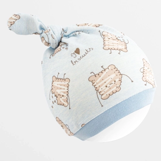 Cuffietta elegante e confortevole per neonati della collezione Biscuits in colore blu, ideale per l’uso quotidiano. La stampa integrale di teneri biscotti aggiunge un tocco giocoso all’outfit, mentre il nodino in cima è un dettaglio adorabile che conquista a prima vista.