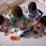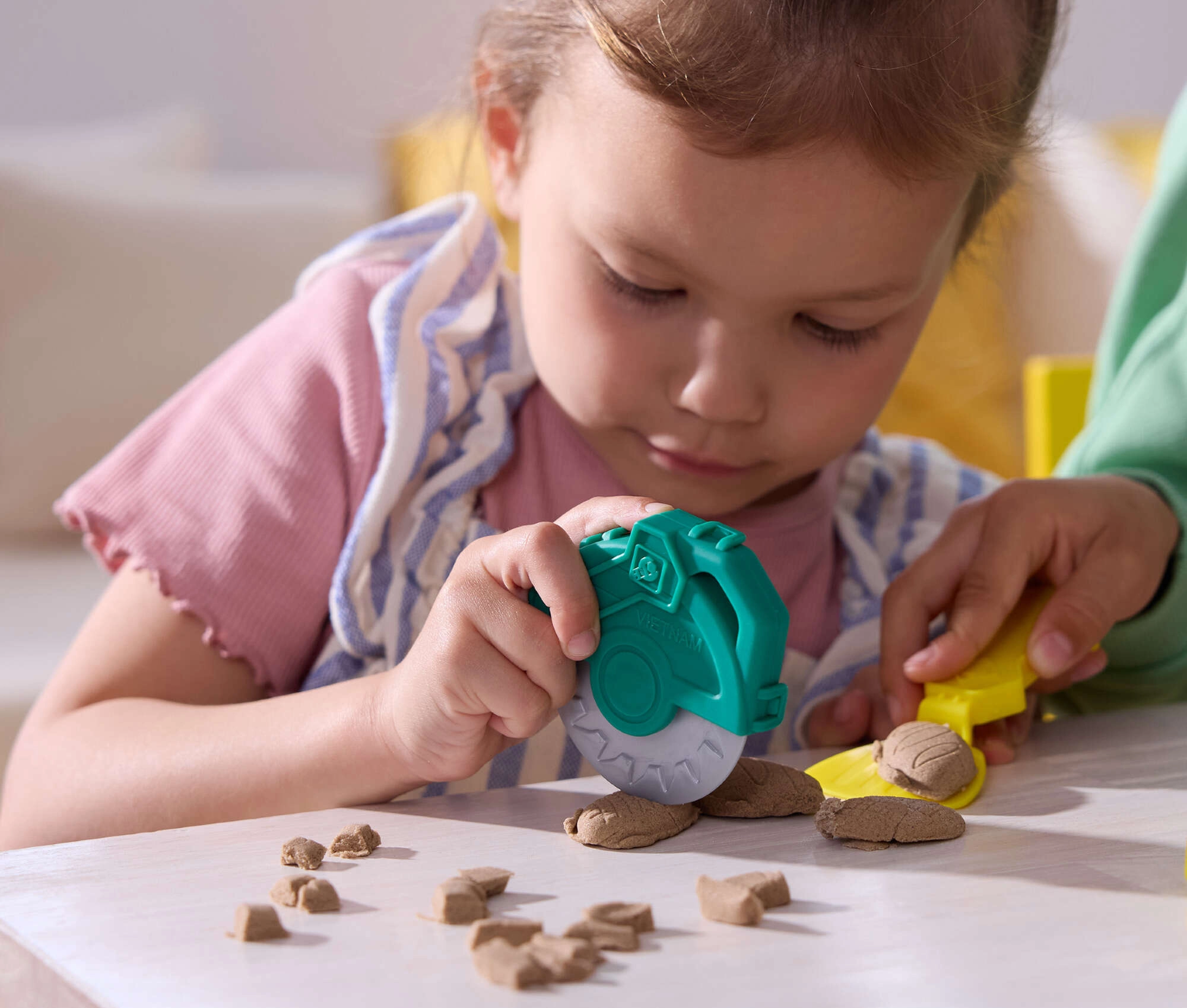 Inclusa la figurina esclusiva di Nonno Gravel – un costruttore esperto e mentore che ispira il lavoro di squadra e il gioco creativo. Grazie alla ricca dotazione di stampi (ad es. stampo per pizza, ciotola, cucchiaini, bicchierini, ciotola per cane) i bambini possono preparare “prelibatezze” e modellare pezzi da costruzione, sviluppando così creatività e abilità motorie.