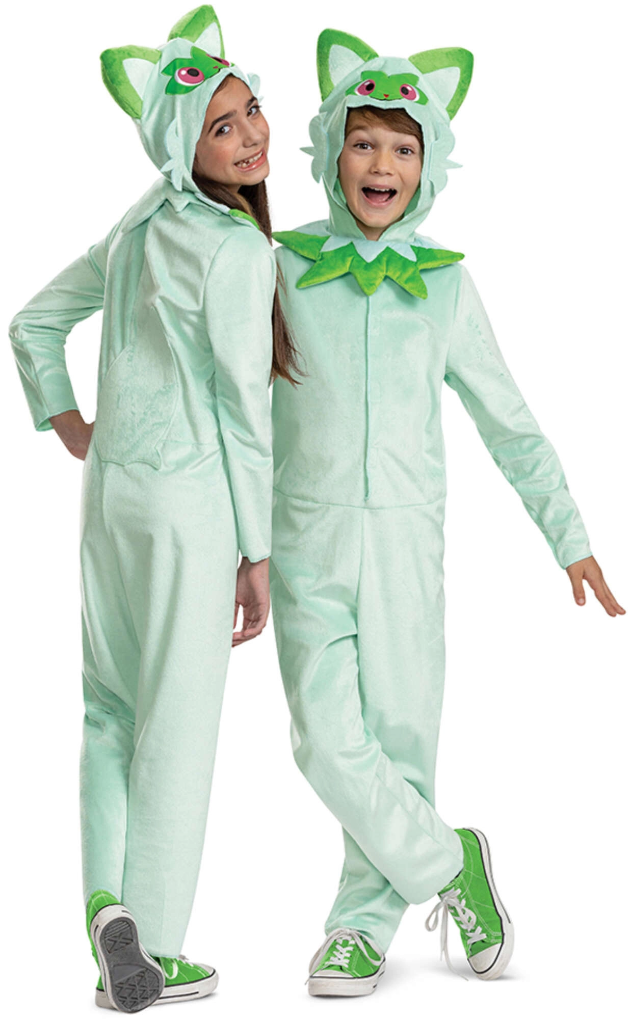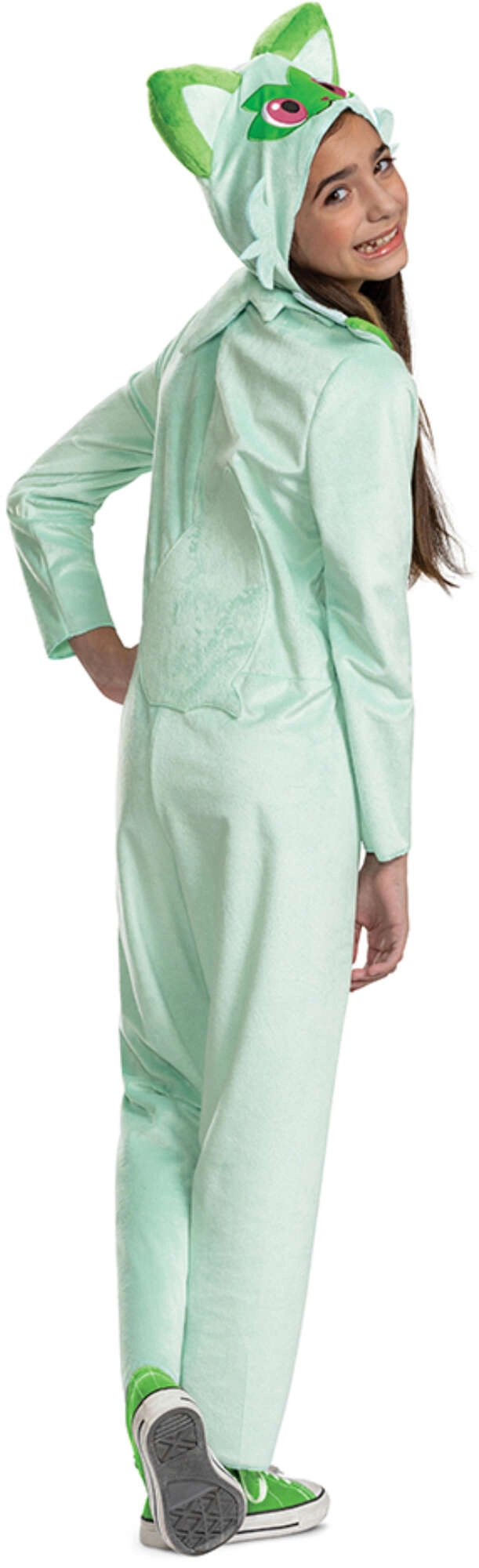 Il cappuccio integrato con grandi orecchie, occhi e colletto a foglia riproduce fedelmente l’aspetto di Sprigatito e dona al costume un tocco incantevole.