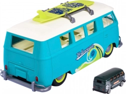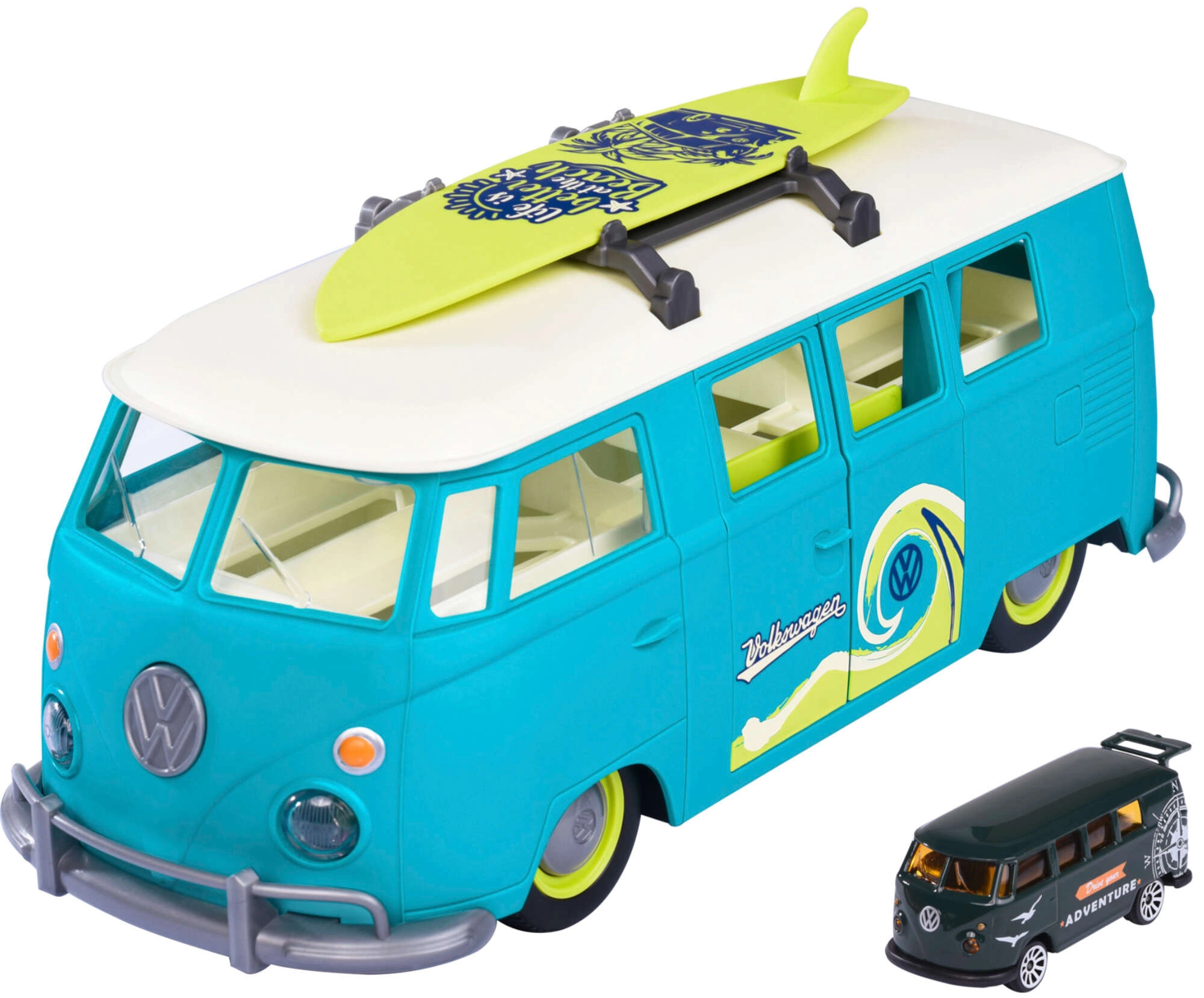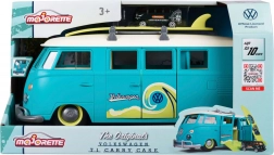 Il grande Volkswagen T1 interattivo di MAJORETTE entusiasma per la lavorazione precisa e i dettagli autentici del leggendario camper. Il portatore a forma di furgoncino in colore verde acqua con elementi color crema si apre trasformandosi in una pratica valigetta di gioco con posti auto per la mini macchinina inclusa. Il pulsante anteriore a forma di logo VW attiva luci intense.