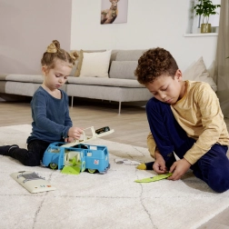 Il tetto è removibile, sul portapacchi si trova una tavola da surf staccabile e la parte posteriore è dotata di sportello ribaltabile con vano “motore”. La resistente struttura in plastica è adatta al gioco quotidiano e sviluppa la motricità fine e la fantasia dei bambini dai 3 anni.