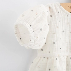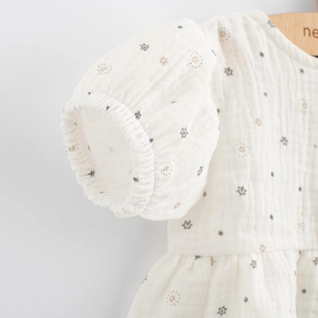 Leggerissimo vestito in mussola New Baby Zora a maniche corte, perfetto per le giornate estive. Il taglio ad A e la gonnellina arricciata assicurano comfort e stile. La chiusura con bottoni sul davanti facilita la vestizione e la mussola 100% cotone è traspirante, morbida e delicata sulla pelle sensibile dei bambini.