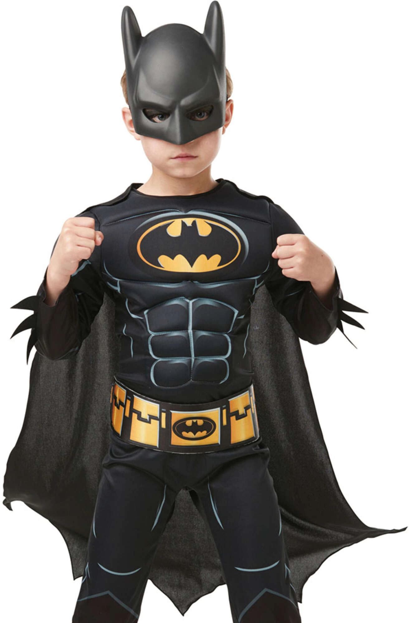 Stampa dettagliata dei muscoli, iconico logo BATMAN e cintura “utility” gialla conferiscono al costume un realistico stile da fumetto.