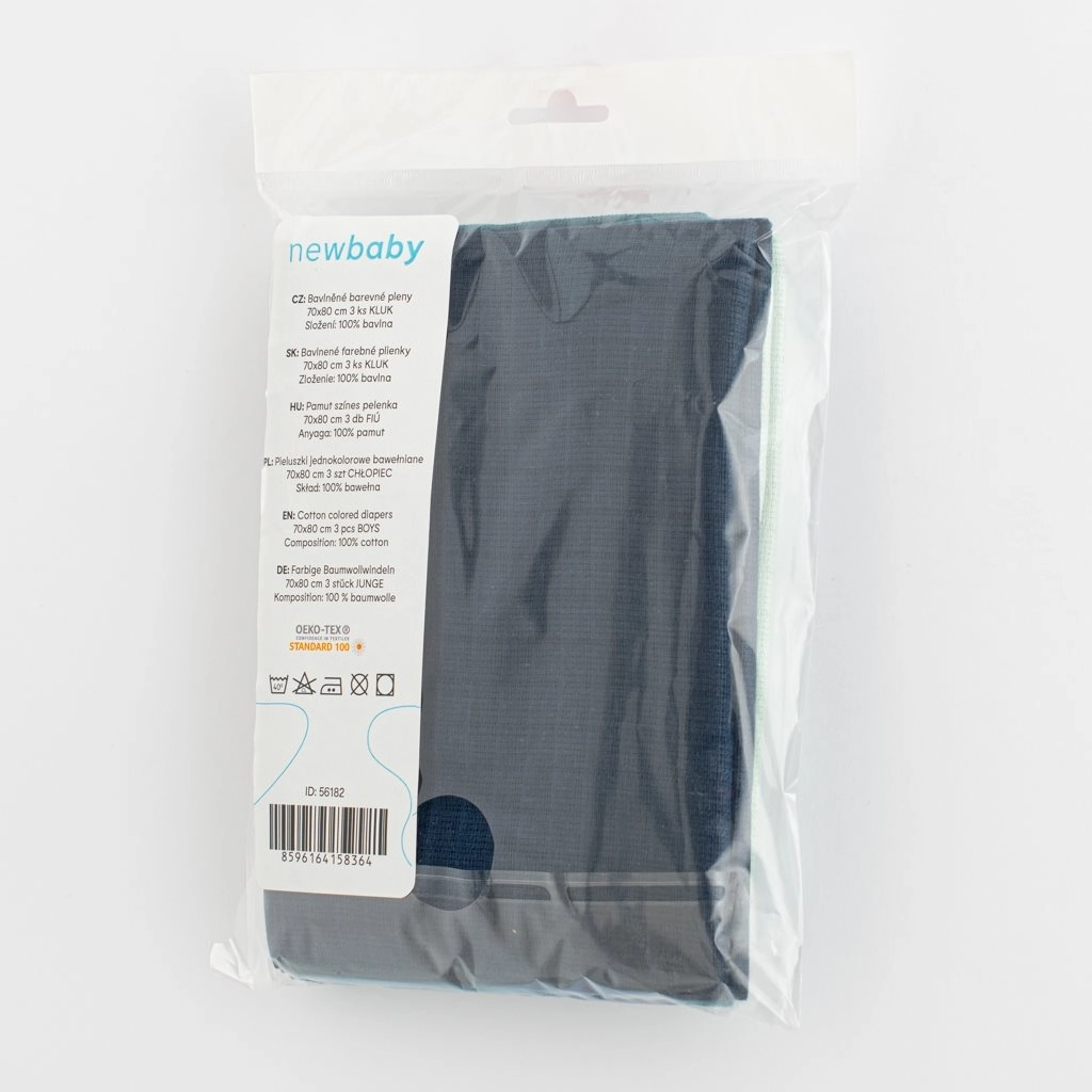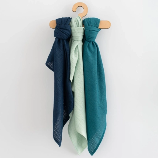 Pratico set di tre pannolini per bambini NEW BABY in 100% cotone, dimensioni 70 × 80 cm, ideale per la cura quotidiana del neonato. Offrono morbidezza, traspirabilità e alta assorbenza, sono delicati sulla pelle sensibile e armonizzati nei colori adatti ai maschietti. Perfetti per il cambio, sotto la testa nella culla o nel passeggino e come aiuto universale per il corredo.