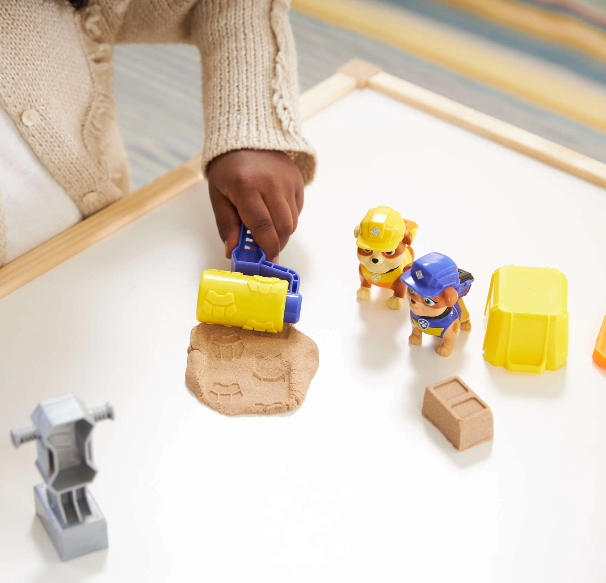 Entra nel mondo delle costruzioni con il simpatico bulldog Rubble e la sua compagna Mix. Il set colorato con sabbia cinetica offre ai bambini un “vero cantiere” dove, grazie al rullo con impronte di zampette e allo strumento per compattare, possono creare viottoli, mattoncini e altre costruzioni. Tutto è pensato per le mani dei più piccoli e per un gioco sicuro.
