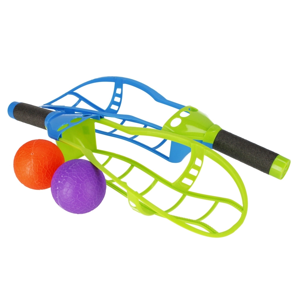Questo colorato set di lanciatori è ideale per giochi in famiglia in giardino, al parco o al campo da gioco. Grazie alla struttura in plastica leggera e alle impugnature sagomate, le palline si rilanciano e si afferrano con facilità, così si divertiranno sia i principianti sia i piccoli sportivi più esperti.