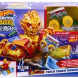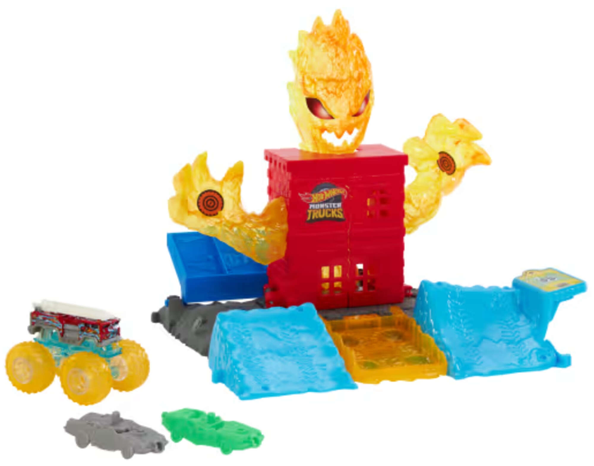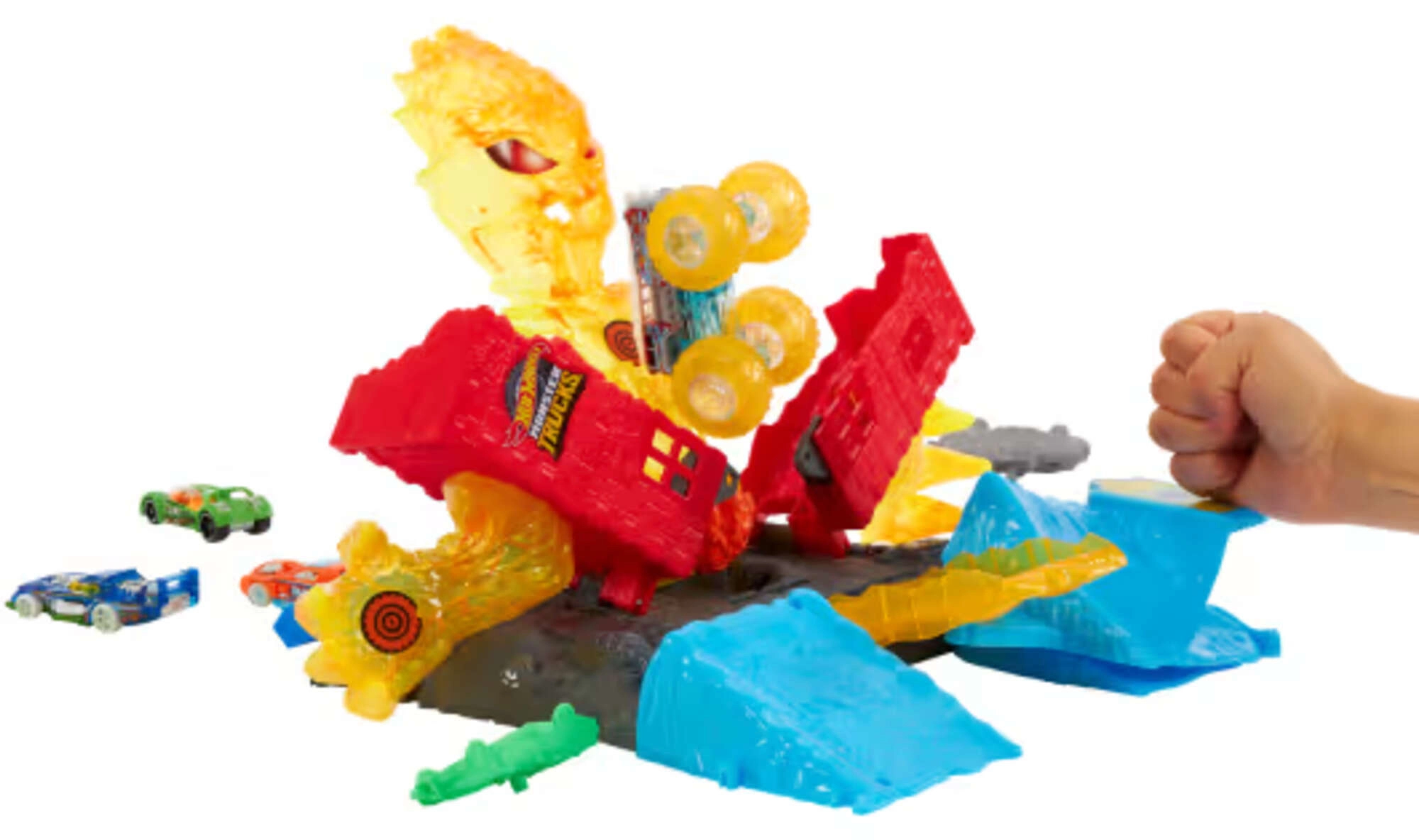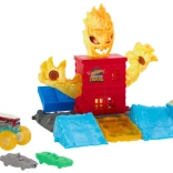 - Contenuto della confezione: arena con torre di fuoco e lanciagomme, monster truck 1:64, 2 macchinine schiacciabili