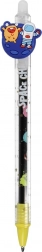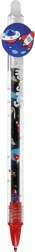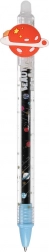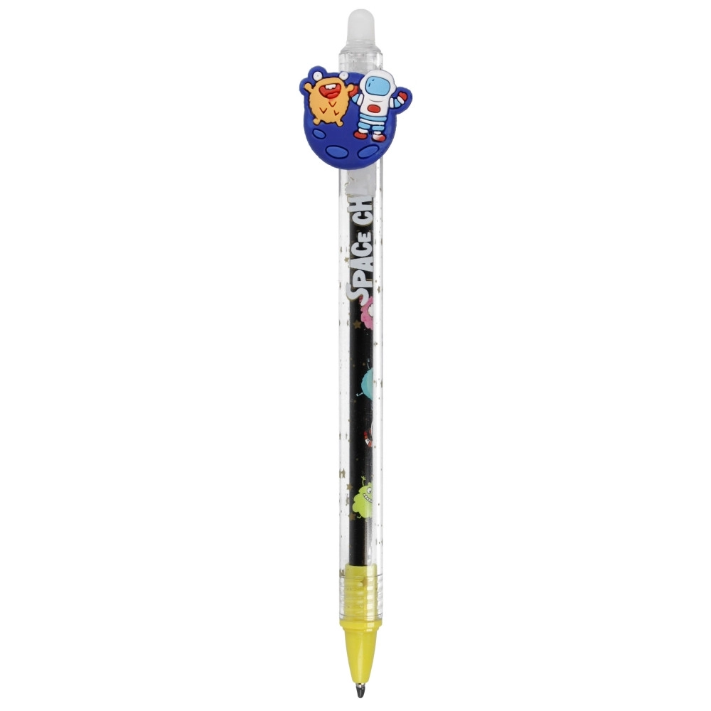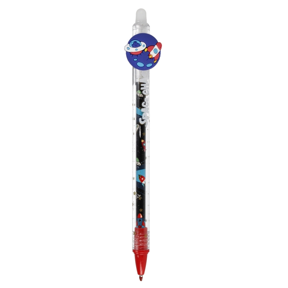 Il corpo trasparente con pianeti, razzi e glitter è completato da un topper divertente: la penna diventa un accessorio di stile per l’astuccio.