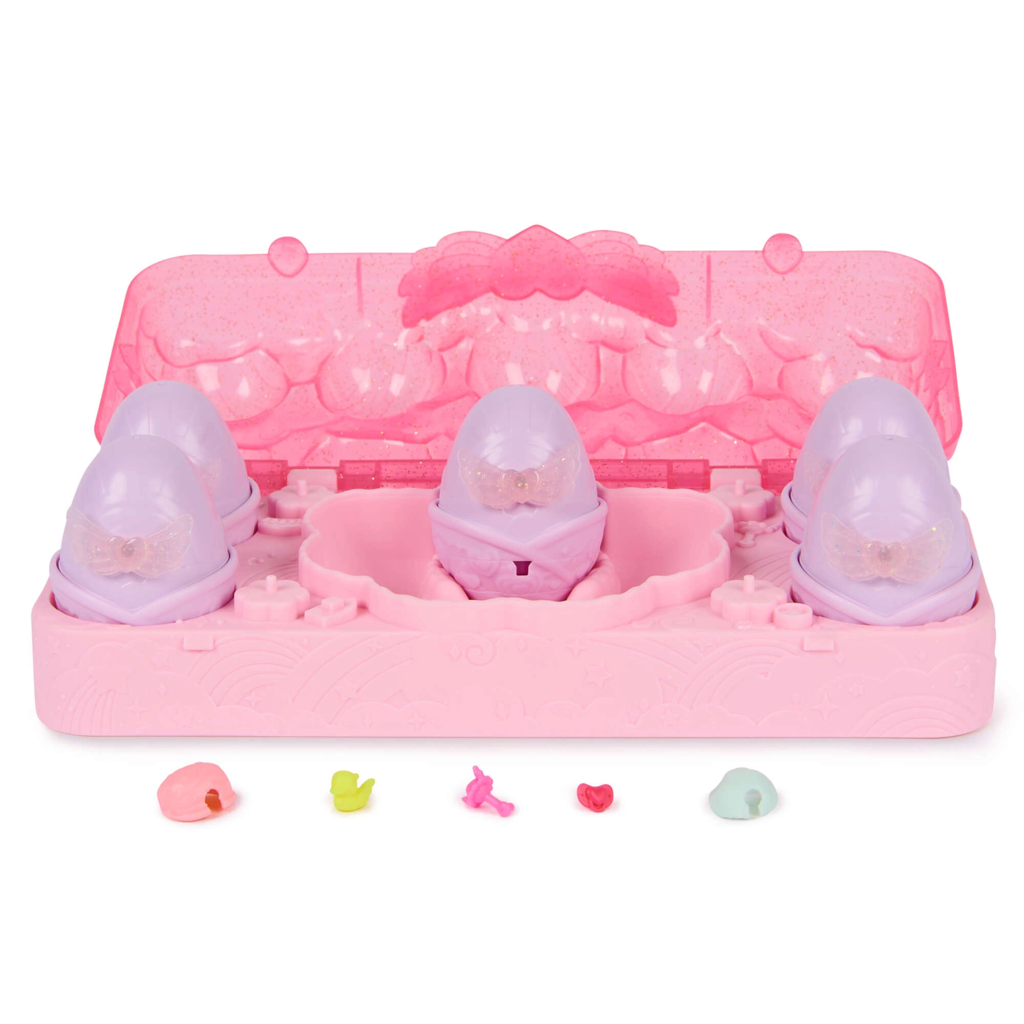 Inclusa una custodia rosa con slot che ripone in sicurezza tutti e cinque gli ovetti e i mini accessori. Il set è ideale per collezionare, giocare ed esporre – un regalo perfetto per i piccoli fan degli HATCHIMALS.