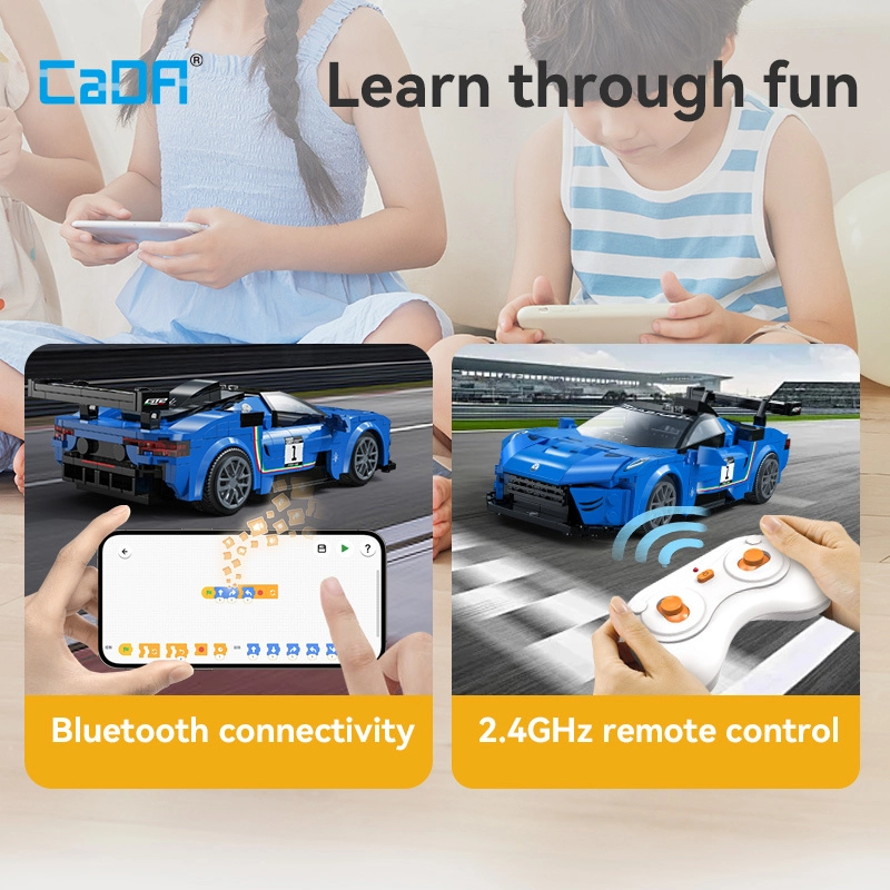 Grazie alla modalità Dual Mode puoi controllare l’auto sia con il radiocomando 2,4 GHz incluso, sia comodamente tramite app Bluetooth (Android/iOS) con una portata di circa 25 metri. Il modello raggiunge una velocità fino a 3,6 km/h, è compatibile con altri set CaDA e sviluppa al meglio abilità manuali, creatività e pensiero tecnico.