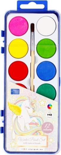 Scopri la magia della pittura con gli acquerelli a tema unicorno. Il set offre 12 tonalità vivaci, facili da miscelare e applicare, ed è completato da un pennello, così puoi iniziare a creare subito dopo l’apertura. Il formato leggero e sottile è perfetto per lo zaino e in viaggio.