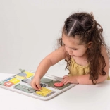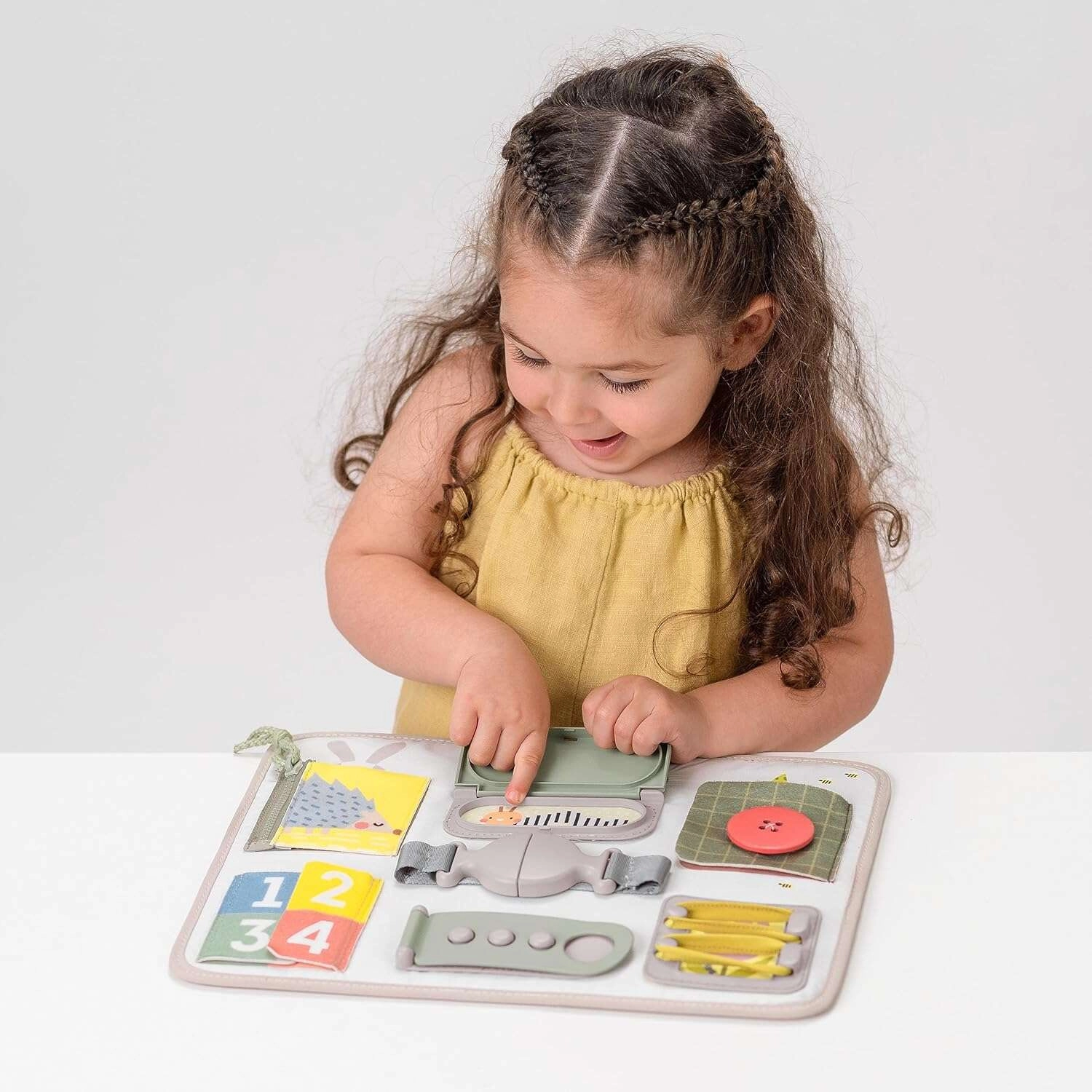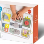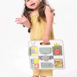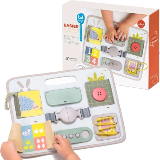 Scopri uno strumento intelligente e sicuro per imparare ogni giorno giocando. TAF TOYS Activity Buckle Board è progettata per bambini dai 18 mesi e combina chiusure pratiche (cerniera, bottone, fibbia, velcro) con elementi sensoriali e attività di conteggio. La maniglia integrata facilita il trasporto, così puoi portarla facilmente in gita, in auto e dai nonni.