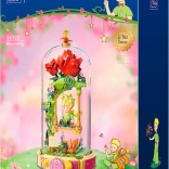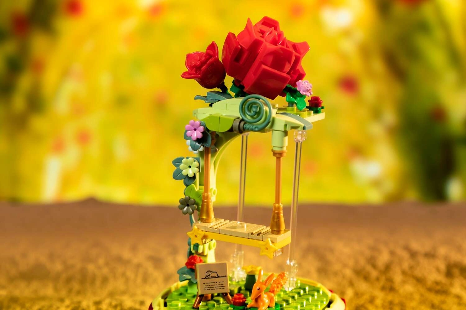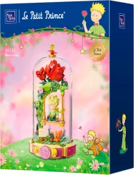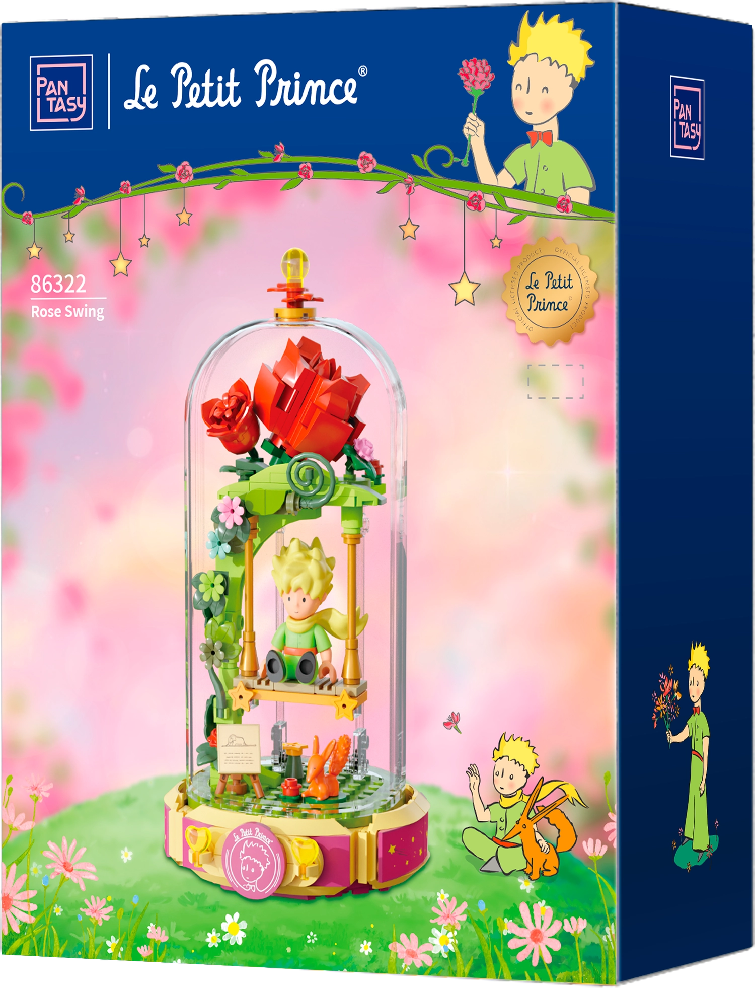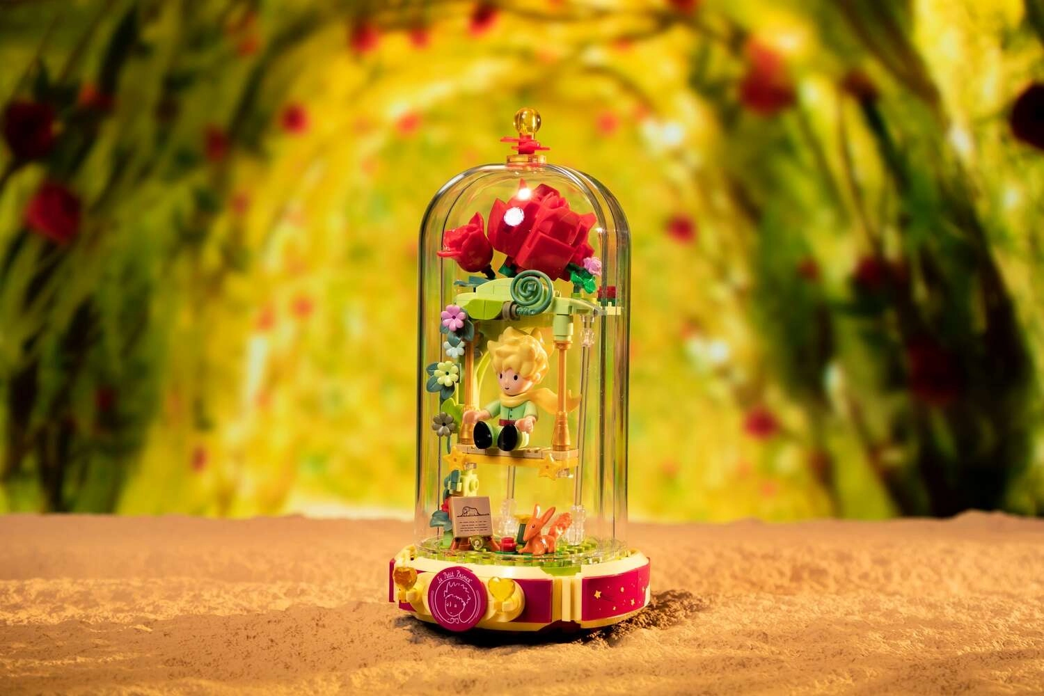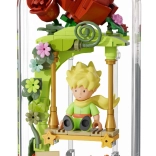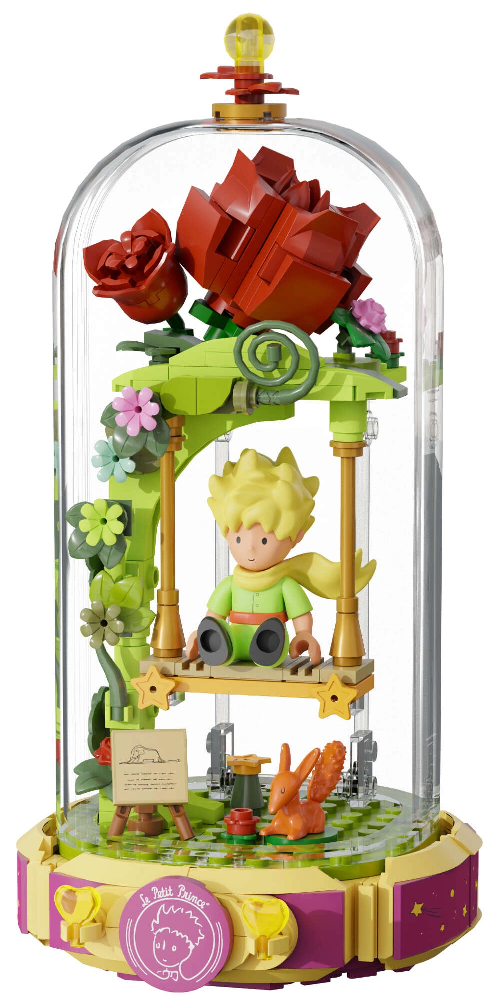 Questo set di design porta la poesia del libro in un delicato diorama: Il piccolo principe è seduto sull’altalena sotto un arco rosato, circondato da fiori, petali e stelle. La scena è protetta da una copertura trasparente, così spicca su una mensola o sulla scrivania e rimane senza polvere.