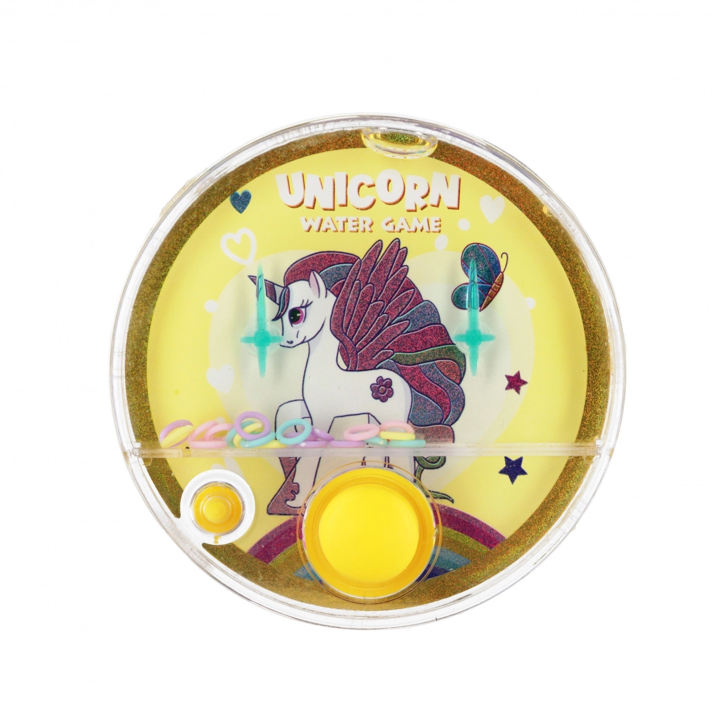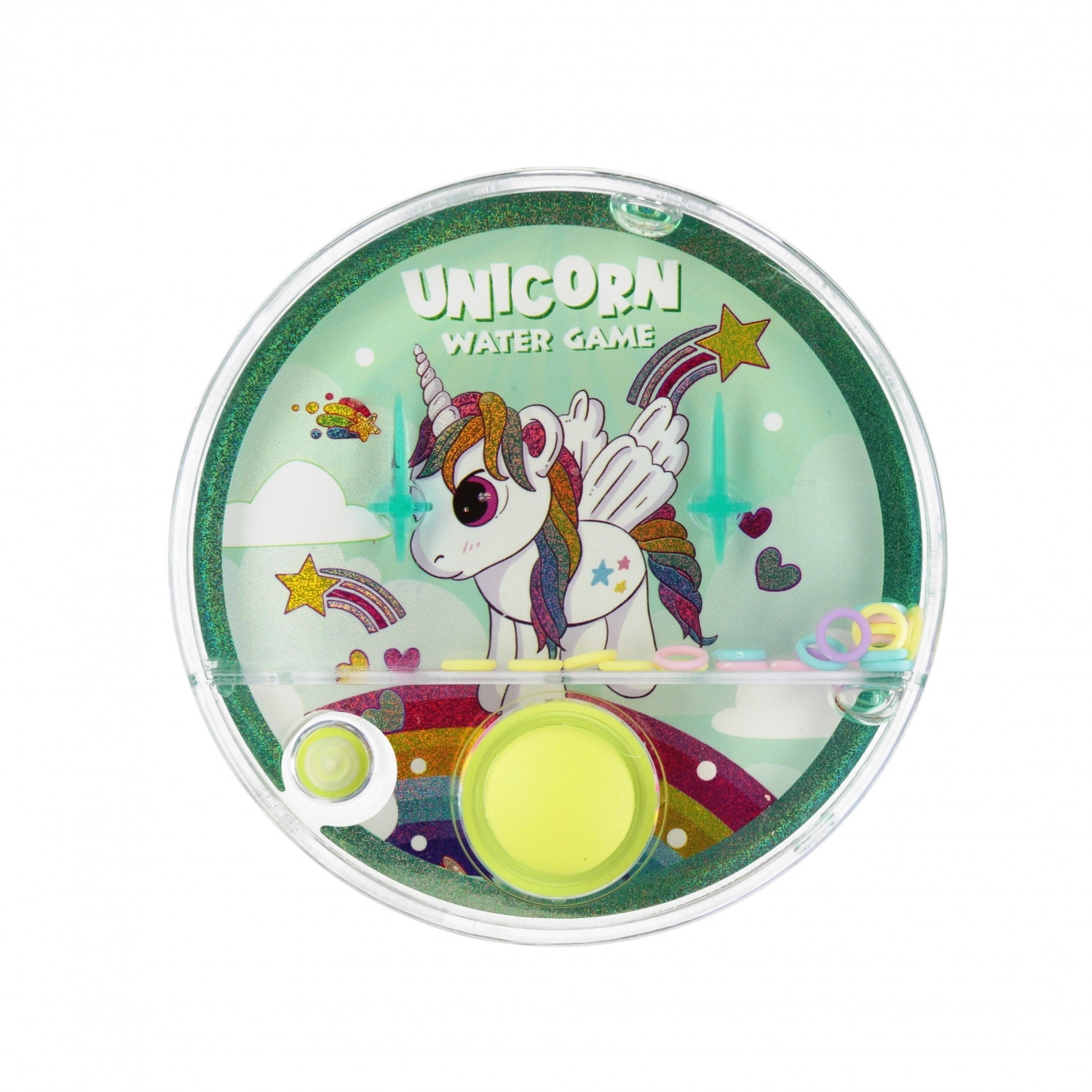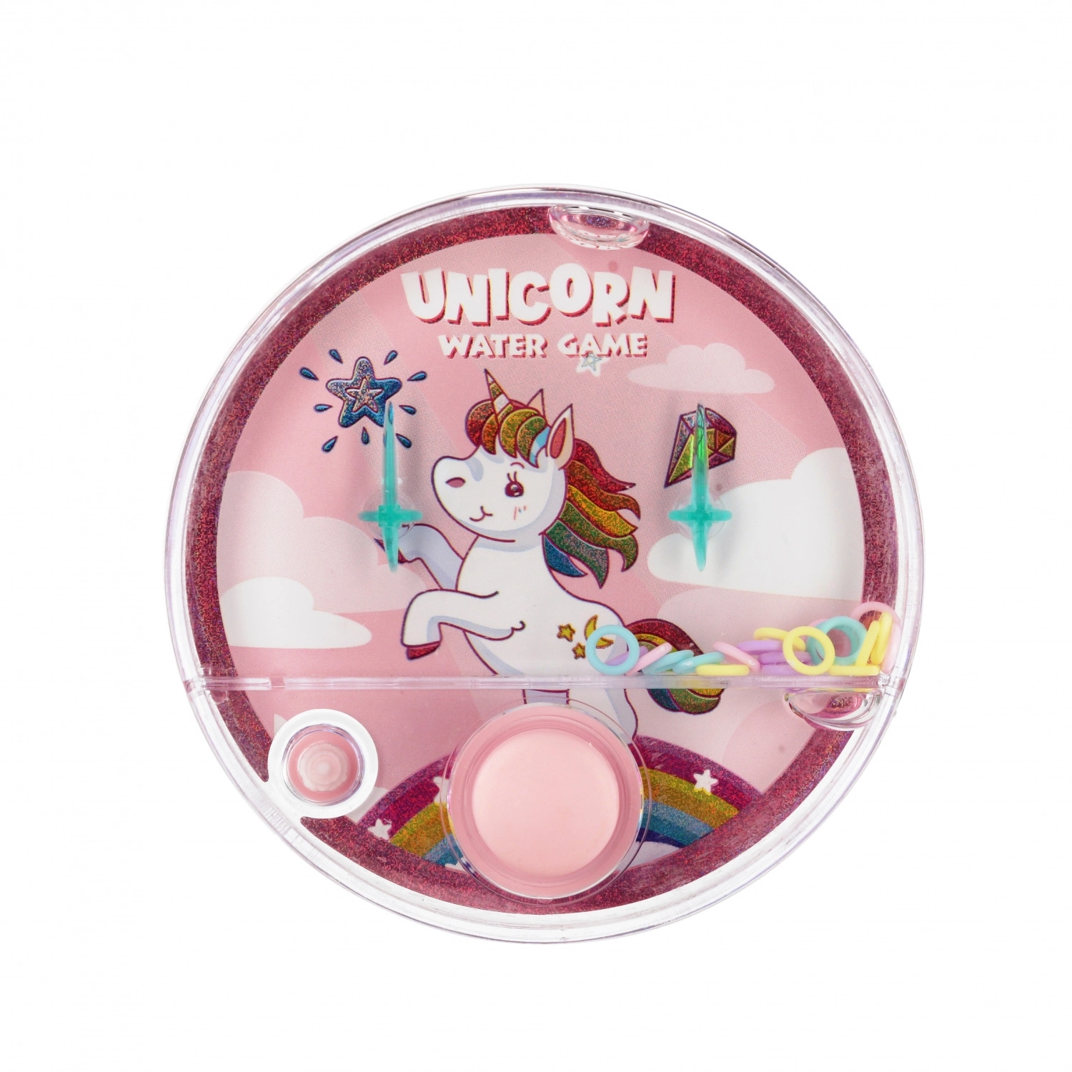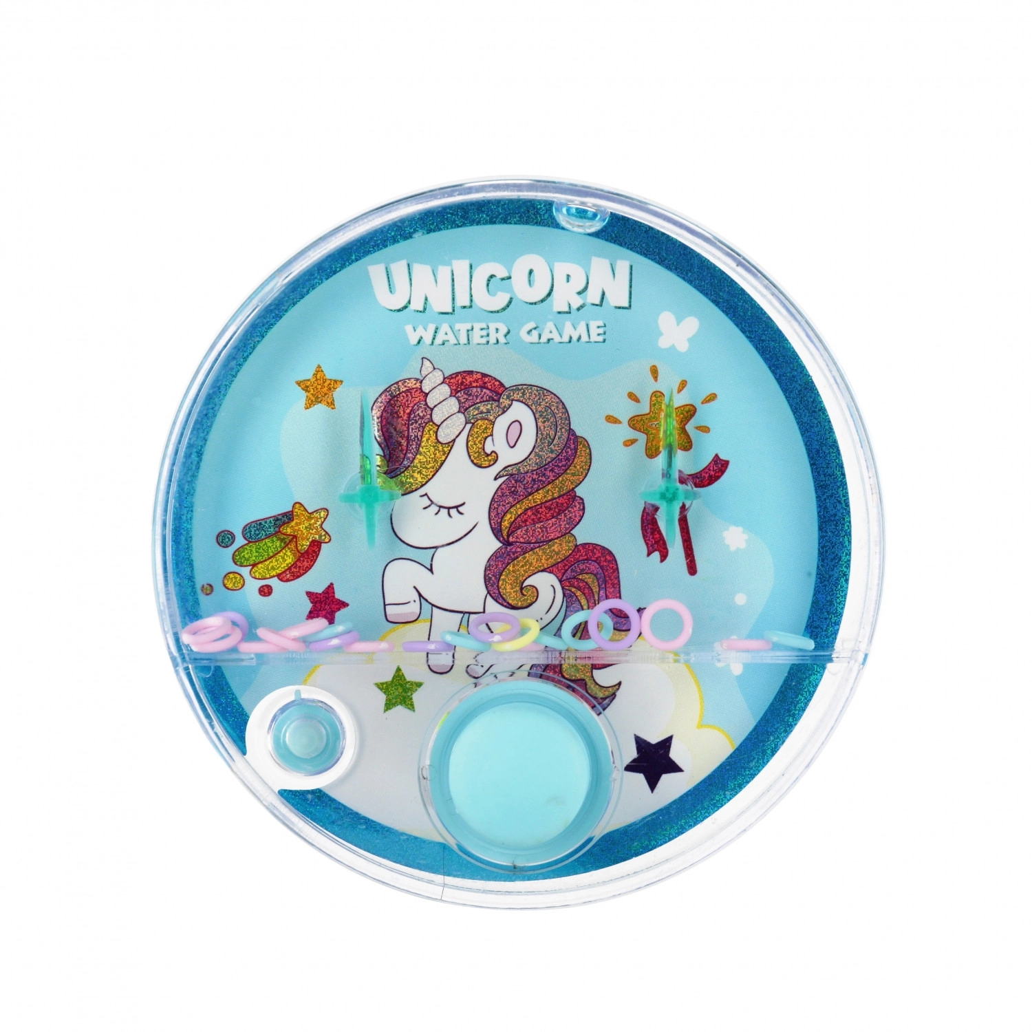 Divertente gioco d’acqua tascabile con unicorno che farà felice ogni bambino. Il formato compatto di 10 cm è ideale per viaggi, scuola e vacanze. Con una semplice pressione dei pulsanti metterai in movimento gli anelli nell’acqua cercando di infilarli sui piolini – divertimento sicuro e coinvolgente per bambini dai 3 anni.