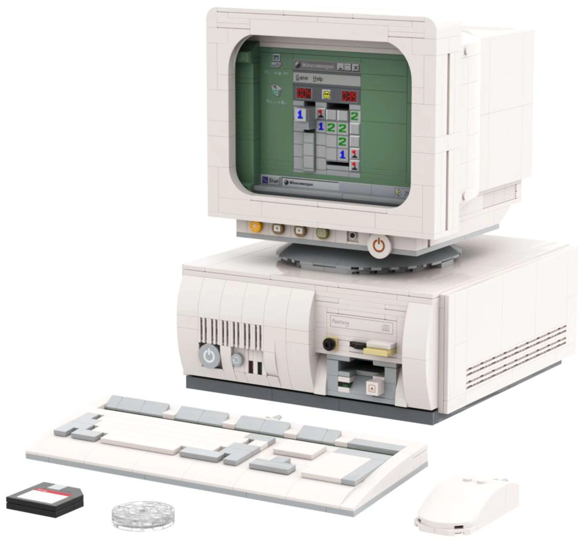 Il modello comprende monitor, unità di sistema, tastiera, mouse, dischetti e CD. Grazie alle funzioni interattive e alle schede display bifacciali puoi cambiare la scena sullo schermo e creare composizioni espositive personalizzate. Inclusi anche un tappetino mouse retrò e pratici scomparti nascosti.