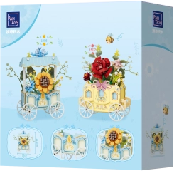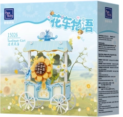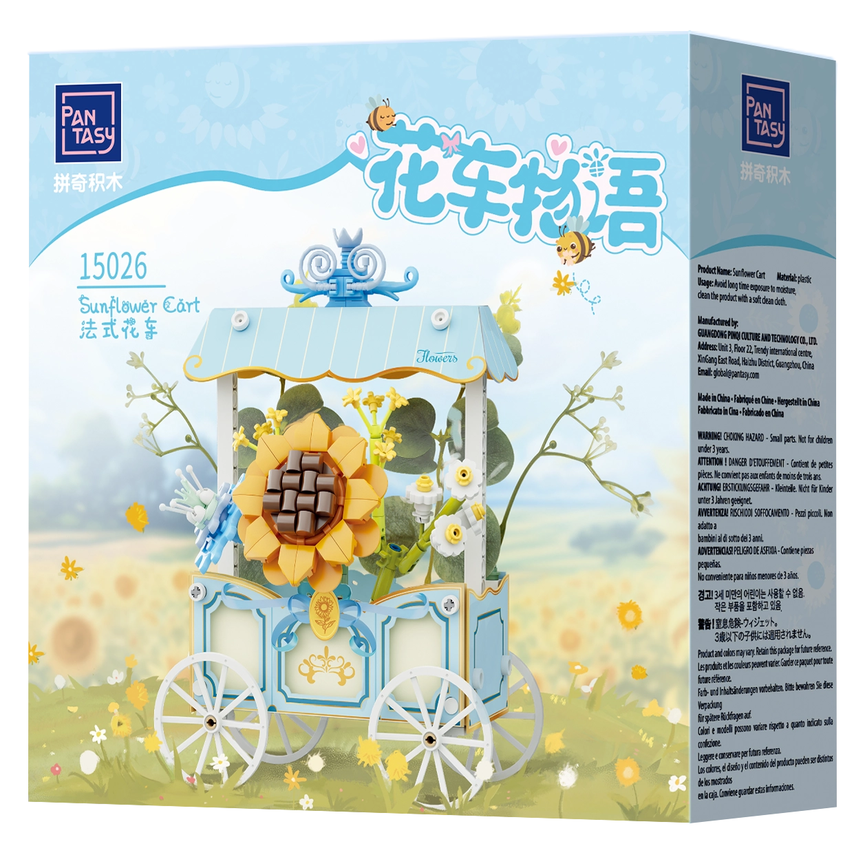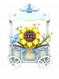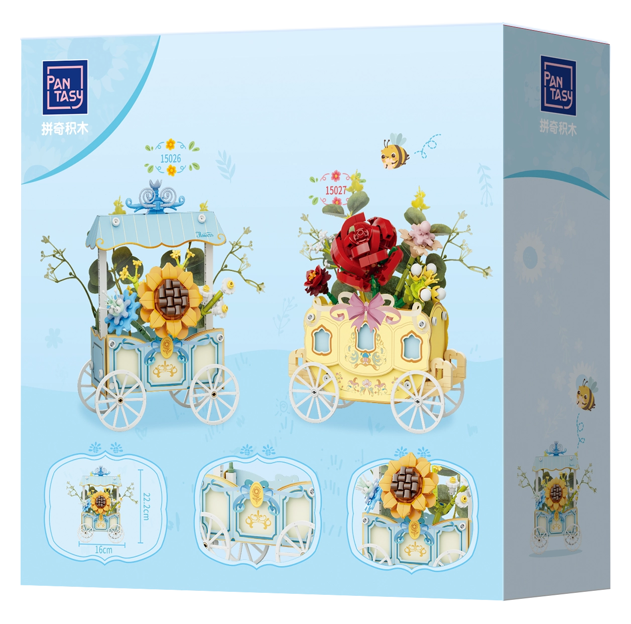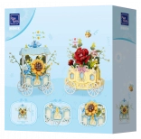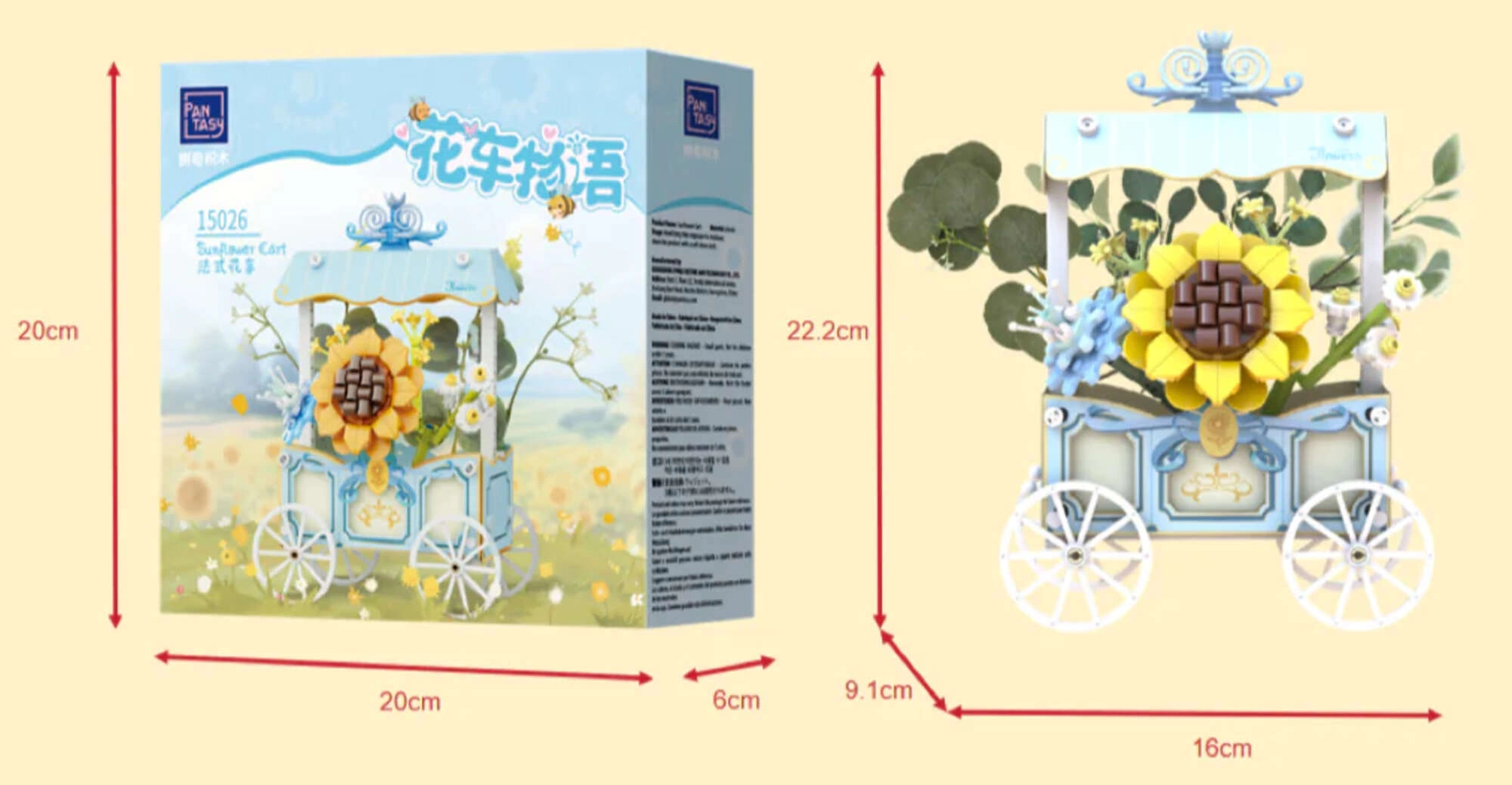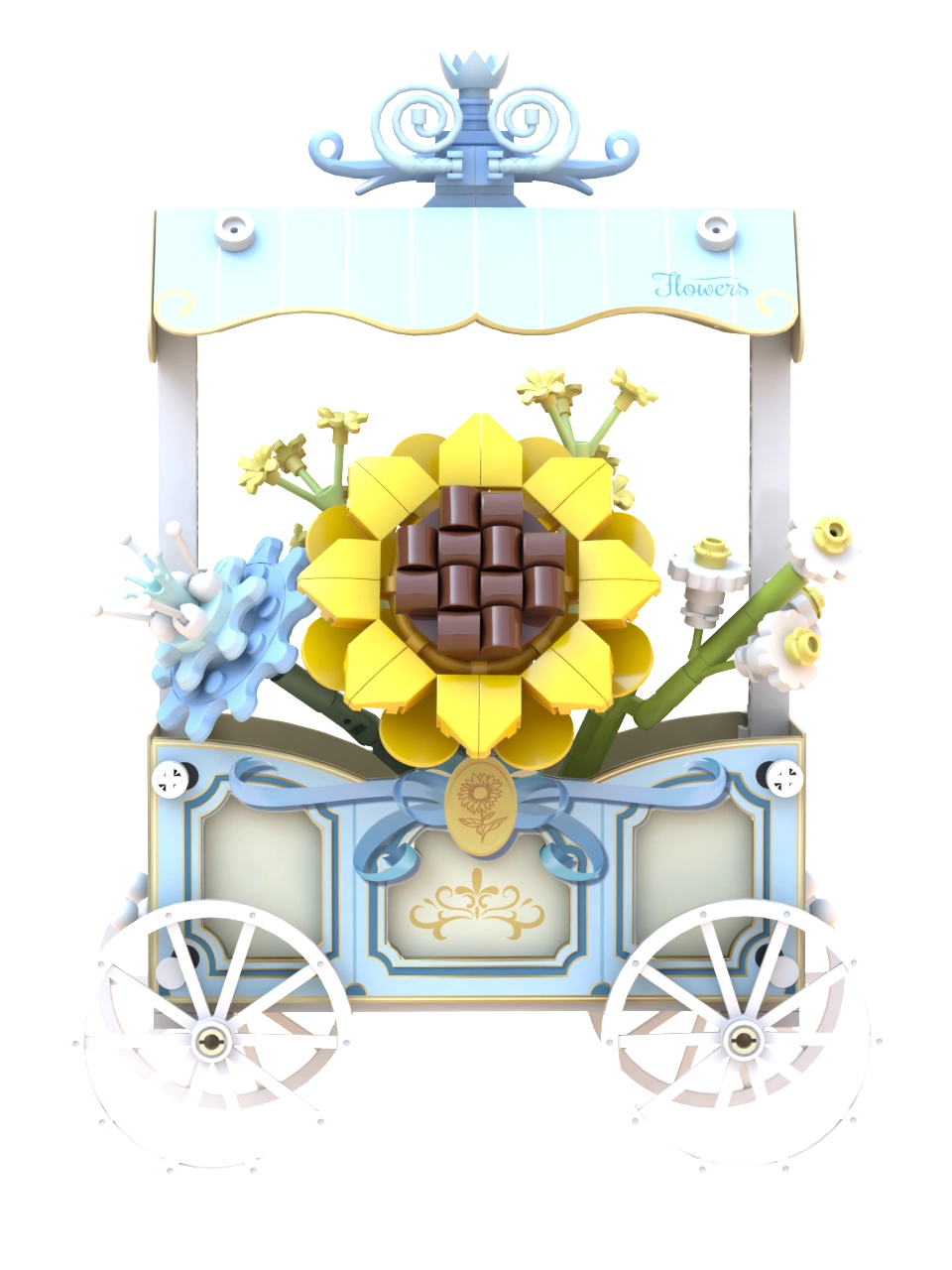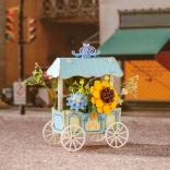 Questo raffinato modello combina costruzione creativa e design decorativo. Il carretto con quattro ruote a raggi è decorato con una tettoia a strisce, delicati ornamenti e un vistoso girasole accompagnato da altri fiori. Tutti i motivi sono stampati direttamente sui pezzi, per una bellezza duratura.