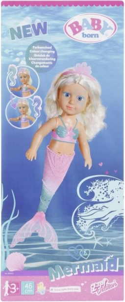 Scopri i segreti del mondo sottomarino con la bambola BABY born sirena. Appena si immerge in acqua, nuota con eleganza e muove la pinna colorata. La sua magia è il cambio di colore: in acqua fredda il rosa diventa turchese e il turchese diventa blu – ogni bagno diventa un'esperienza magica.