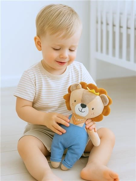 Questo leone di peluche con adorabile coroncina e pantaloncini blu stimola la motricità fine e la fantasia. È perfetto per rassicurare durante la nanna e come fedele compagno nelle scoperte quotidiane. La lavorazione di qualità e i dettagli ricamati garantiscono un uso sicuro senza piccole parti rimovibili.