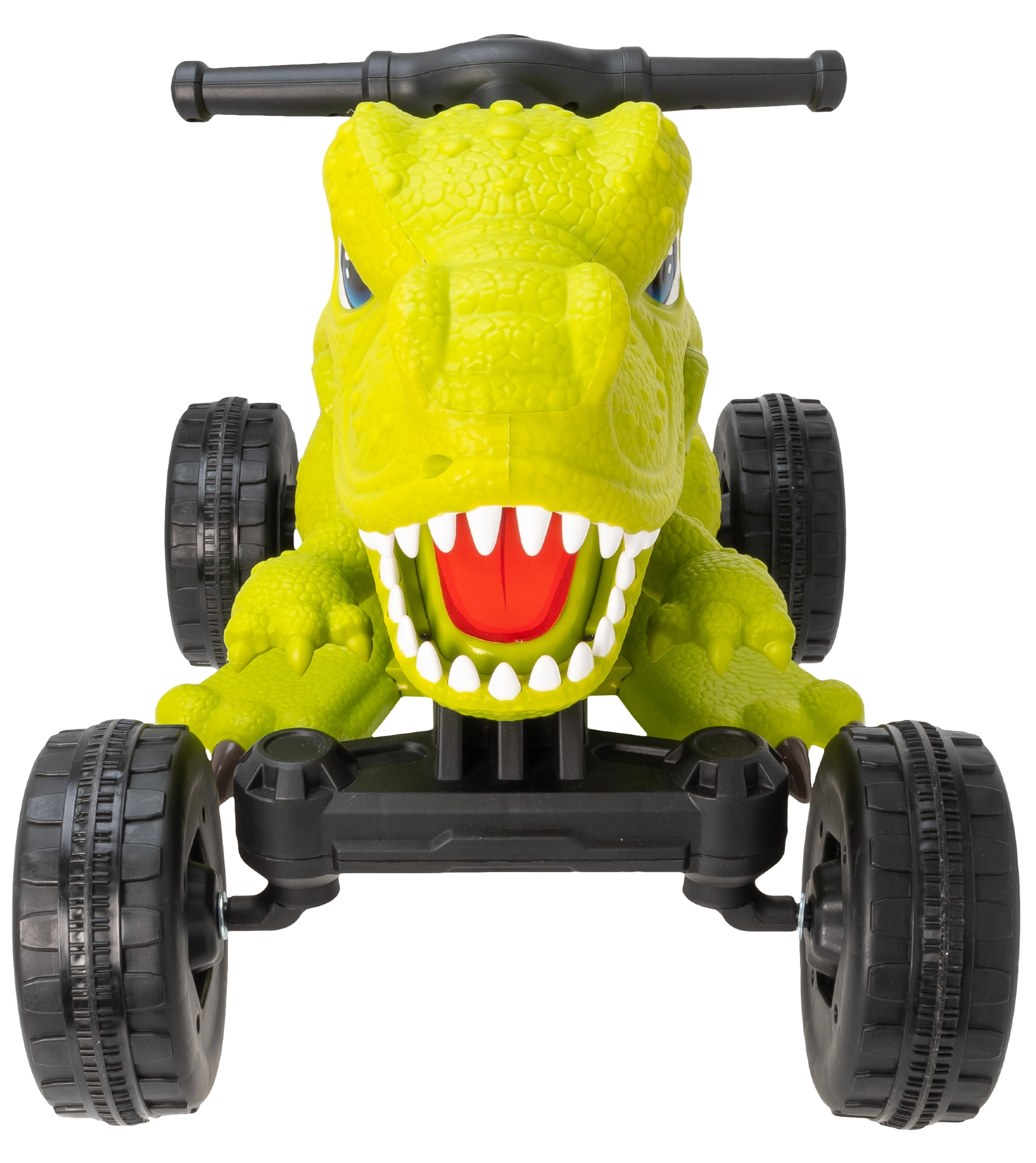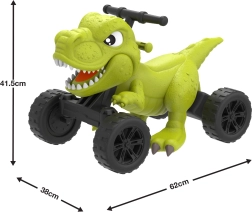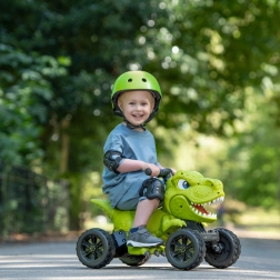 I comandi semplici consentono una marcia fluida in avanti fino a 3 km/h. Le ruote larghe e le pedane antiscivolo aumentano la stabilità, mentre il suono del dinosauro e la bocca che si muove premendo la levetta rendono il gioco interattivo. Inoltre, il colore verde brillante attira l’attenzione dei piccoli piloti.