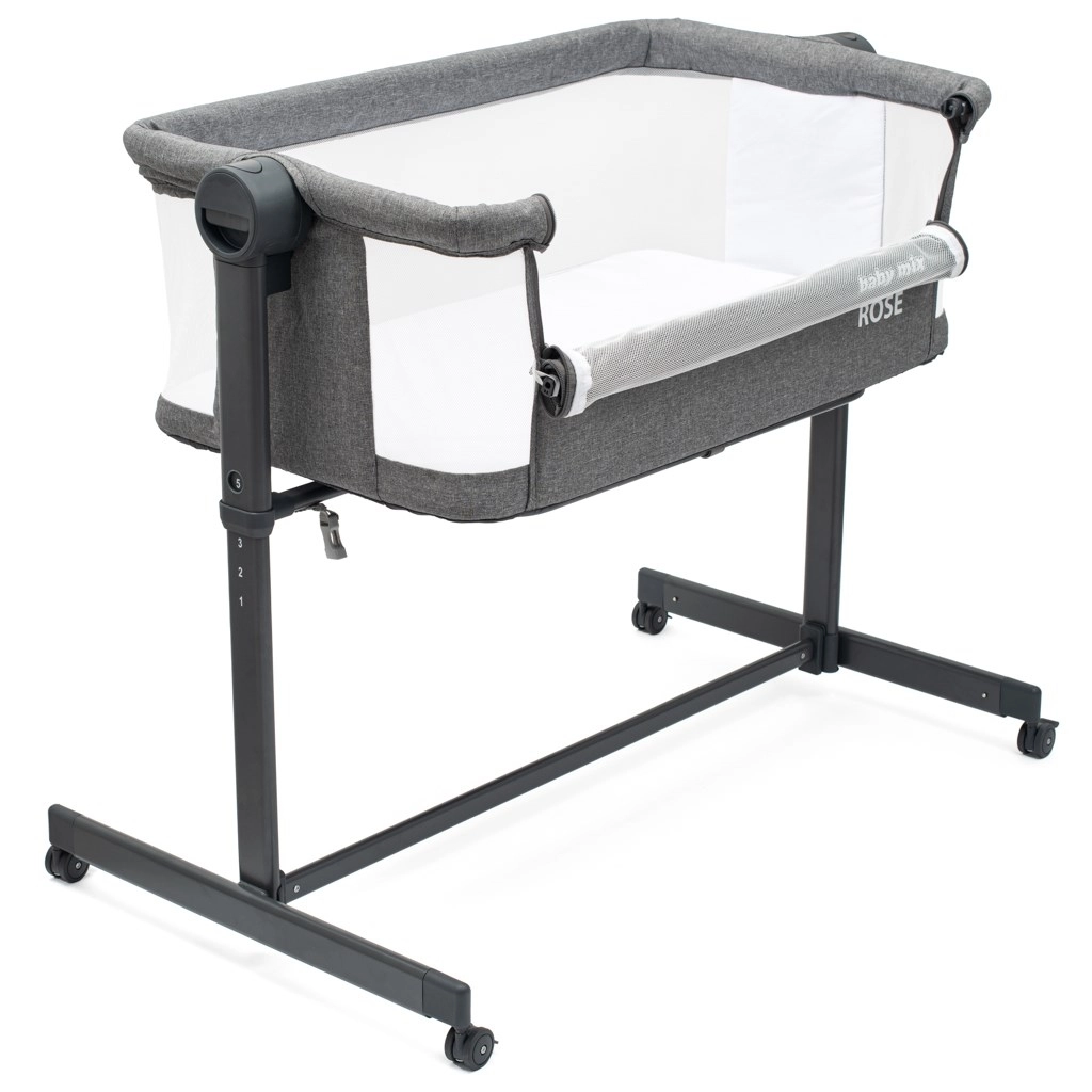 Tieni il bebè vicino e al sicuro con la culla affiancata Baby Mix Rose in elegante grigio. Offre 5 livelli di altezza per un perfetto allineamento al letto dei genitori, ruote silenziose con freno per spostarla facilmente e pannelli laterali in rete traspirante per ottima visibilità e ventilazione. Inclusi materasso confortevole e telaio in acciaio stabile per la massima sicurezza.