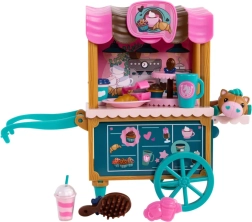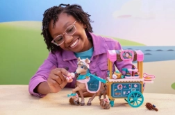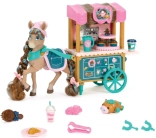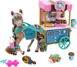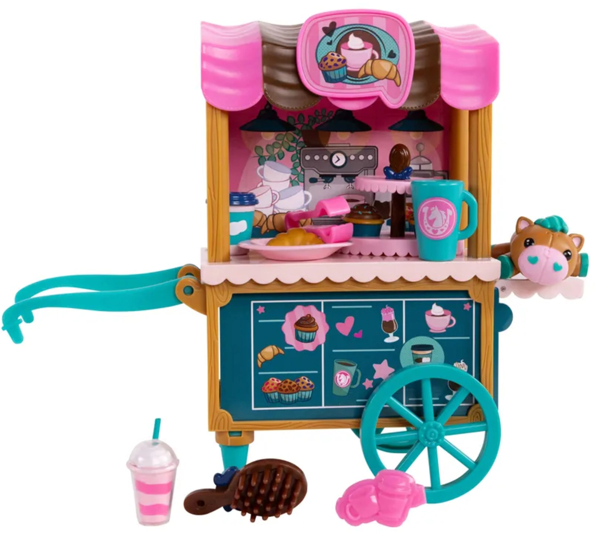 Il carretto ha ruote girevoli, maniglia e ripiani per le bontà, tettoia colorata e grafiche da caffetteria. Il set include anche accessori da servizio e da pasticceria, un piccolo animaletto e una spazzola per sistemare la criniera. Tutto è progettato per il gioco di ruolo creativo, lo sviluppo della motricità fine e il gioco sociale.