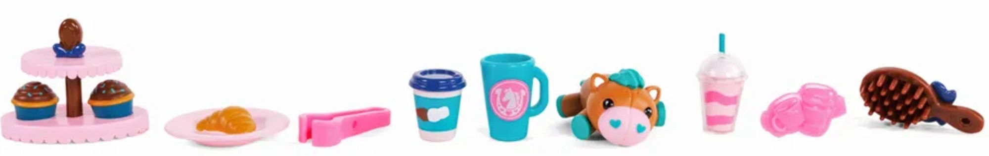Il cavallino ha arti mobili e può tenere gli accessori grazie alle clip a forma di ferro di cavallo. È facile creare diverse scene della caffetteria e della serie.
