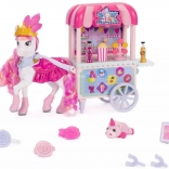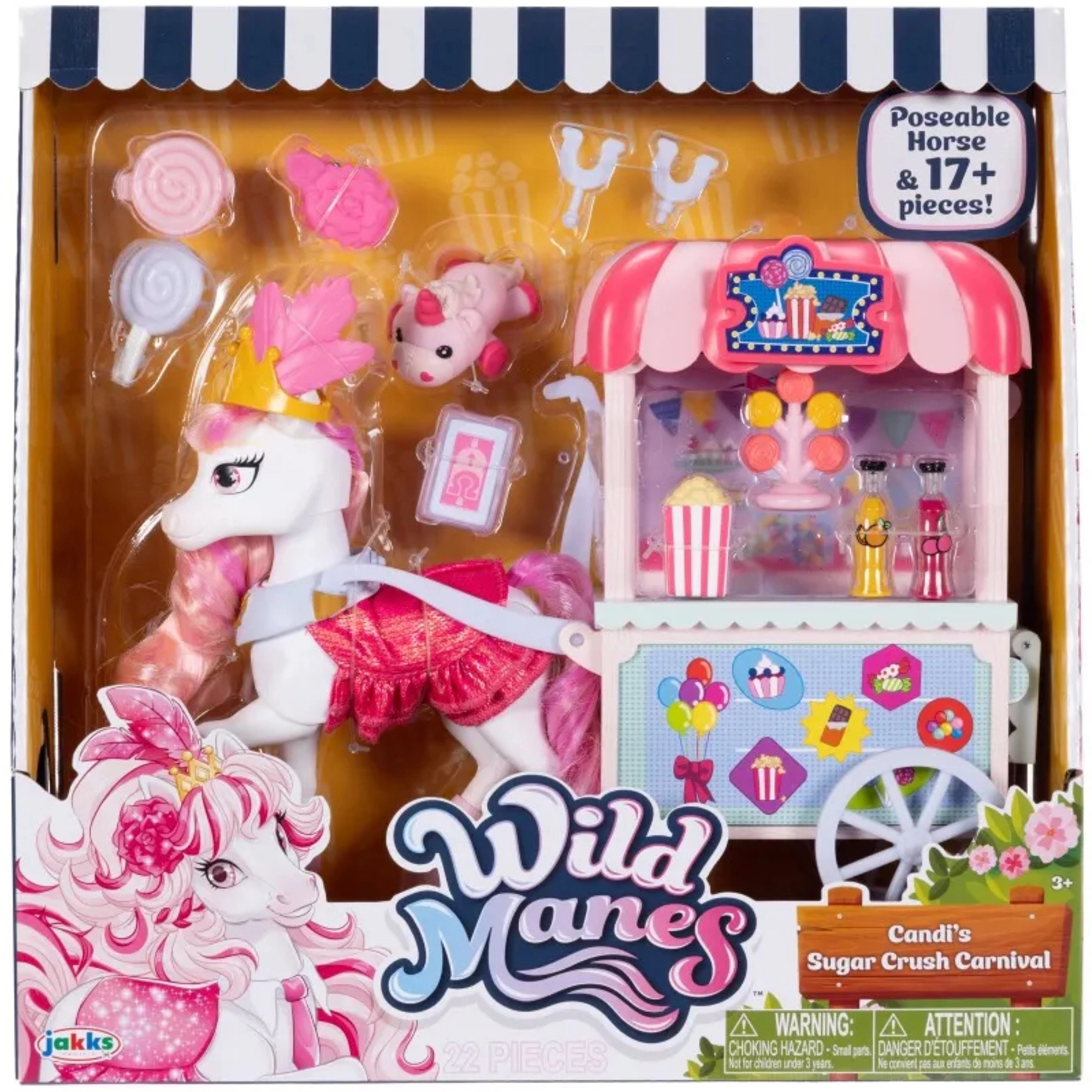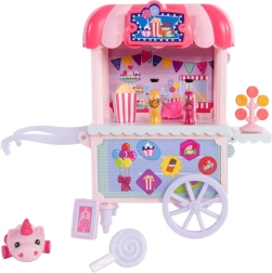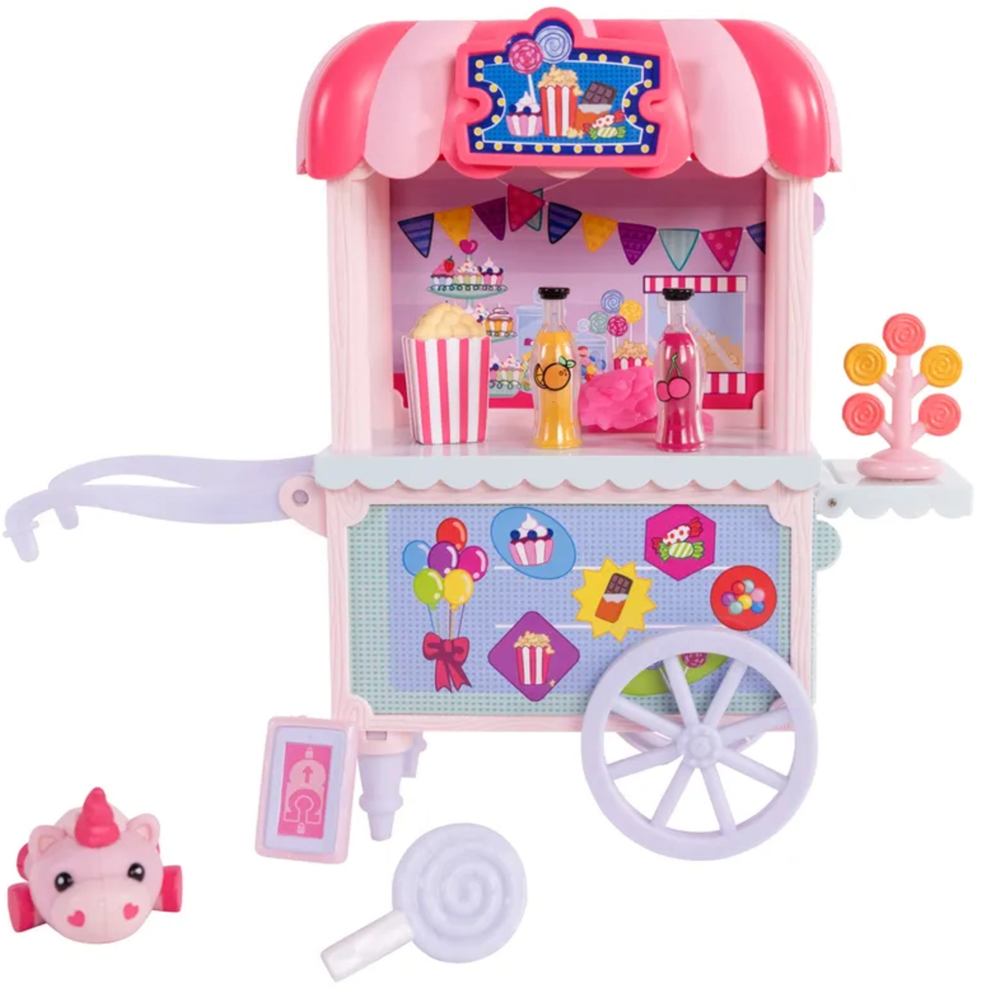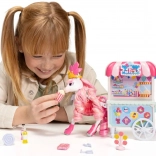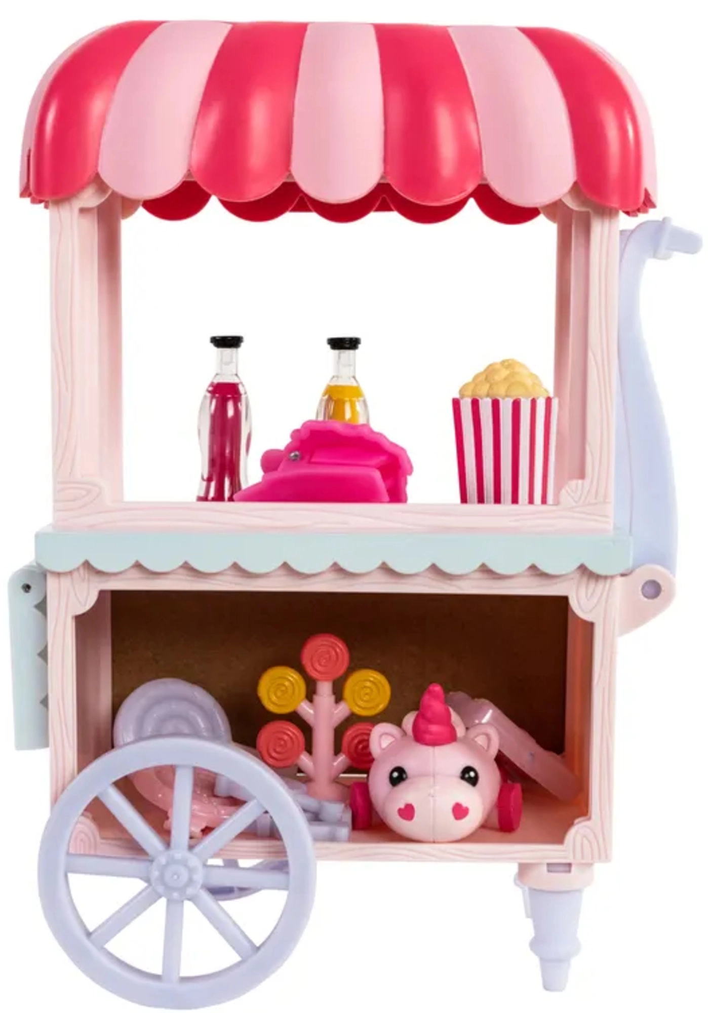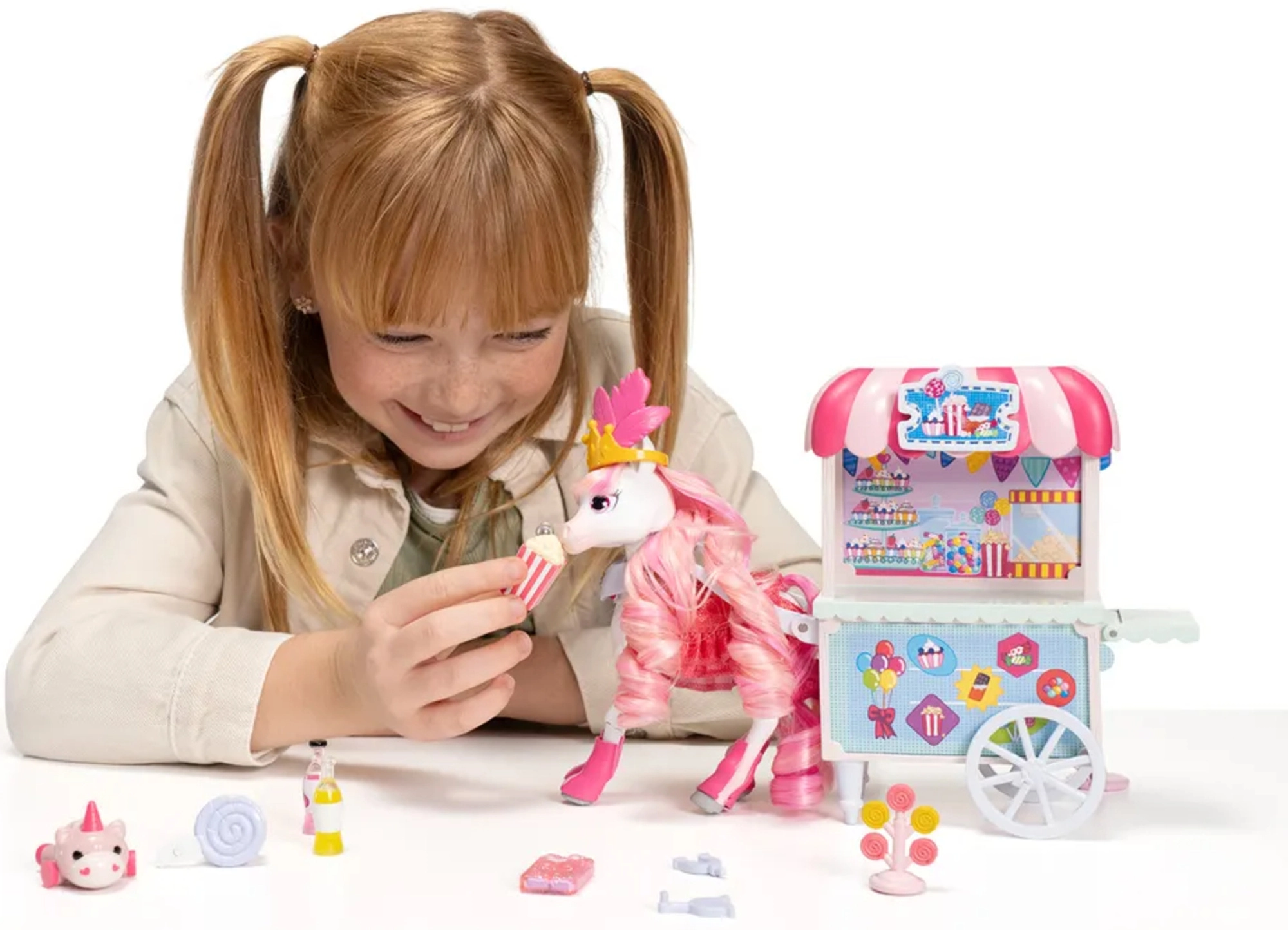 Il colorato chiosco Sugar Rush Carnival con tettoia a righe e ruote funzionanti è pronto per vendere popcorn, lecca-lecca e bevande. Con il gancio/asta di traino il carretto si collega a Candi per partire in un dolce tour nella cittadina di Mane Lane. Inclusi anche accessori per la cura e lo styling – spazzola, mollette e altro.
