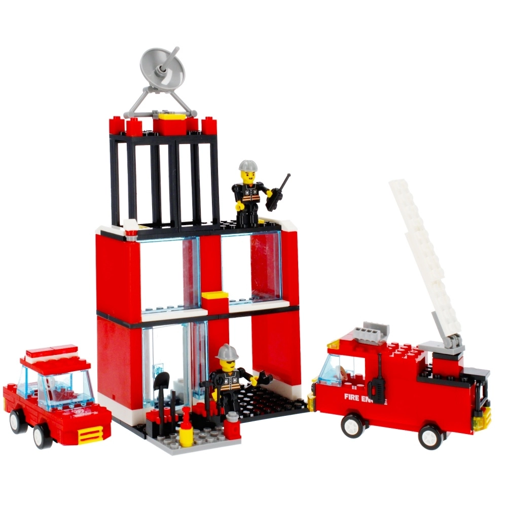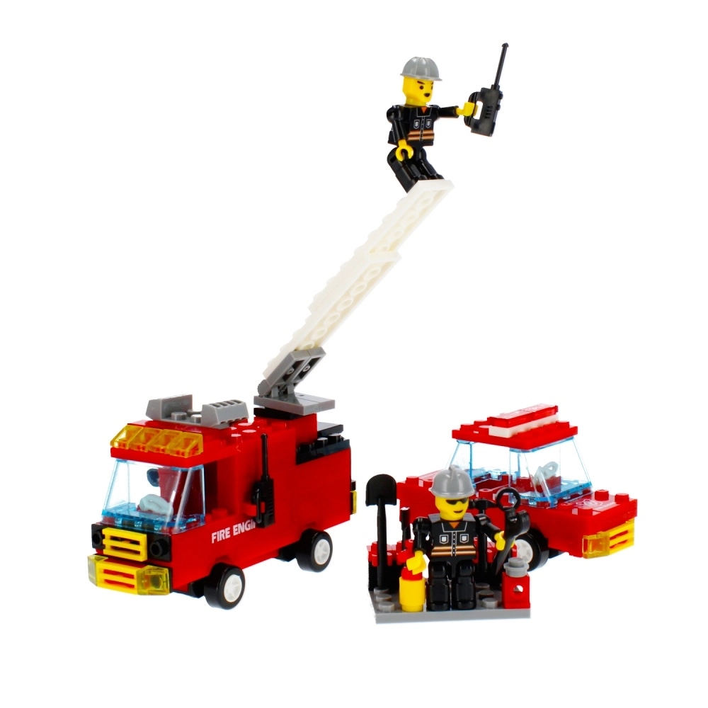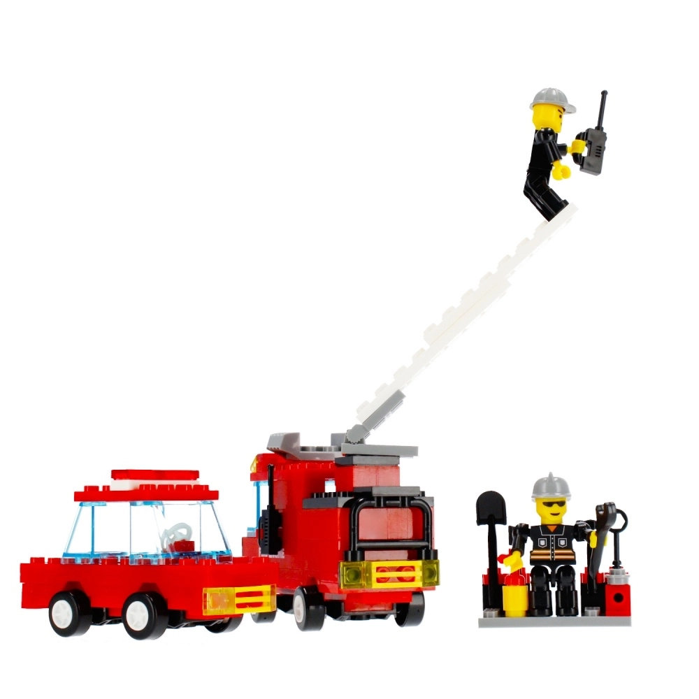 L’autopompa con lunga scala estensibile permette di raggiungere le “fiamme” anche ai piani superiori. Le minifigure con caschi, tubo e ricetrasmittente ampliano le possibilità di gioco.