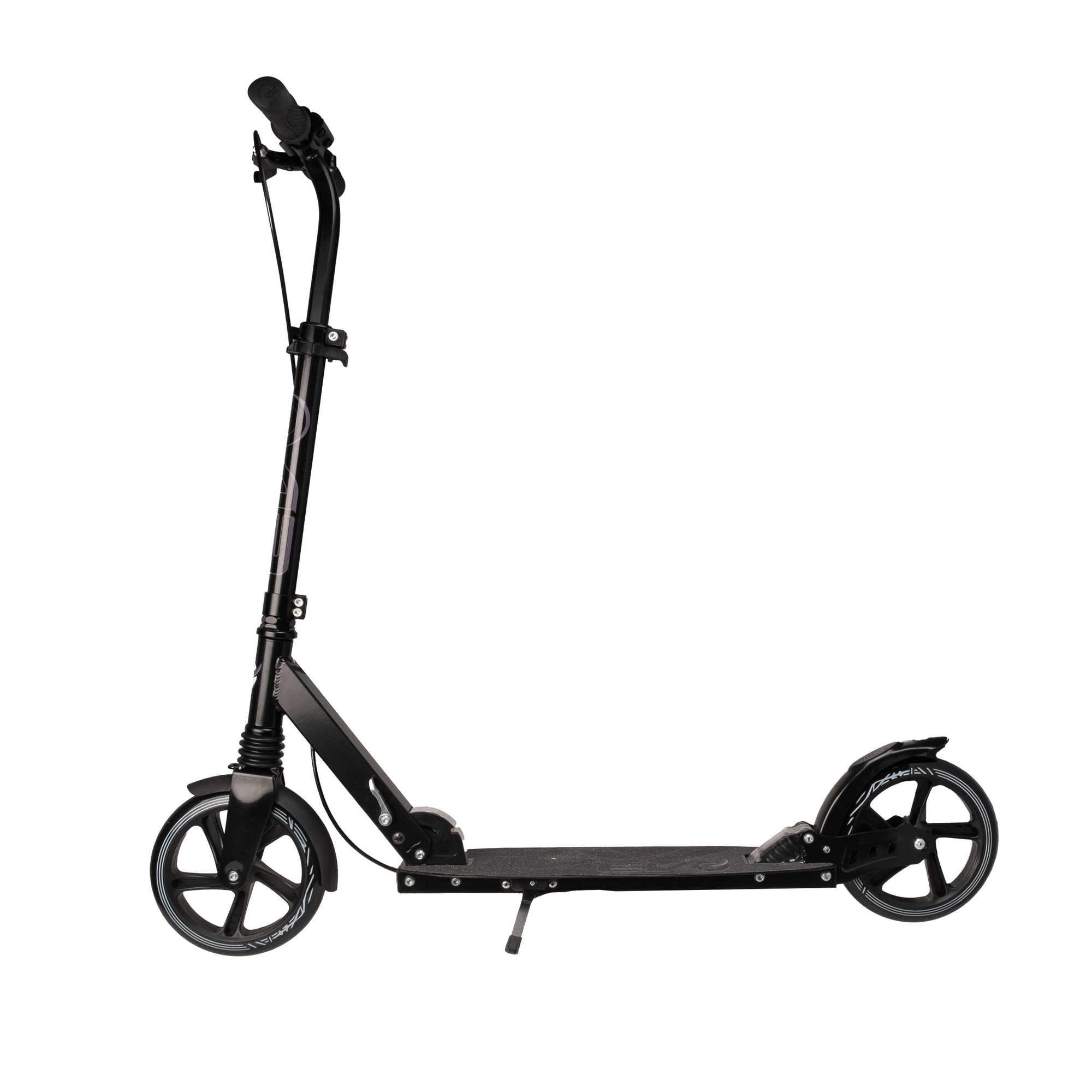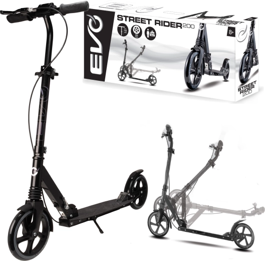 Il monopattino EVO Street Rider 200, leggero e resistente, per rider dagli 8 anni in su, offre grandi ruote da 200 mm, ridotta resistenza al rotolamento grazie ai cuscinetti ABEC-7, sospensioni anteriori e posteriori, meccanismo pieghevole per un trasporto facile e manubrio regolabile in altezza. L’arresto sicuro è garantito dal freno posteriore a pedale e dal freno anteriore a mano, mentre la stabilità è aumentata dalla pedana antiscivolo e dall’utile cavalletto integrato.