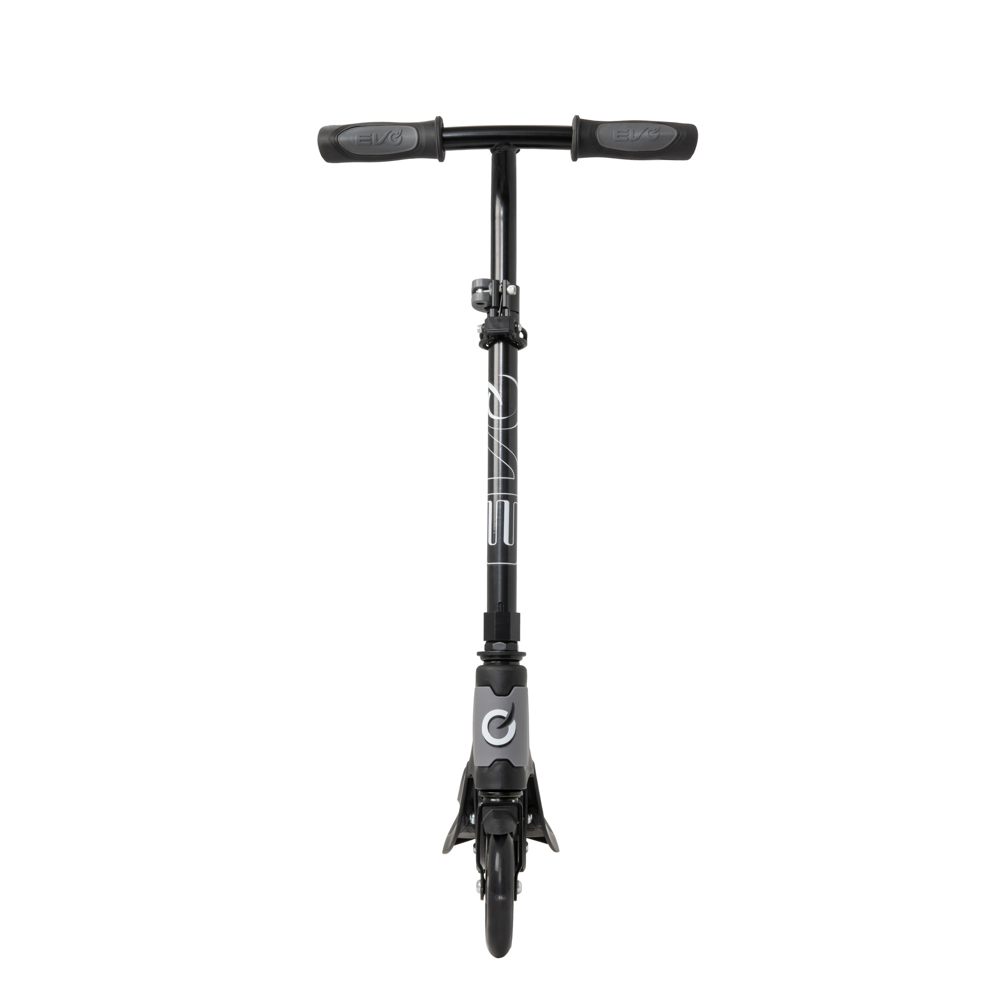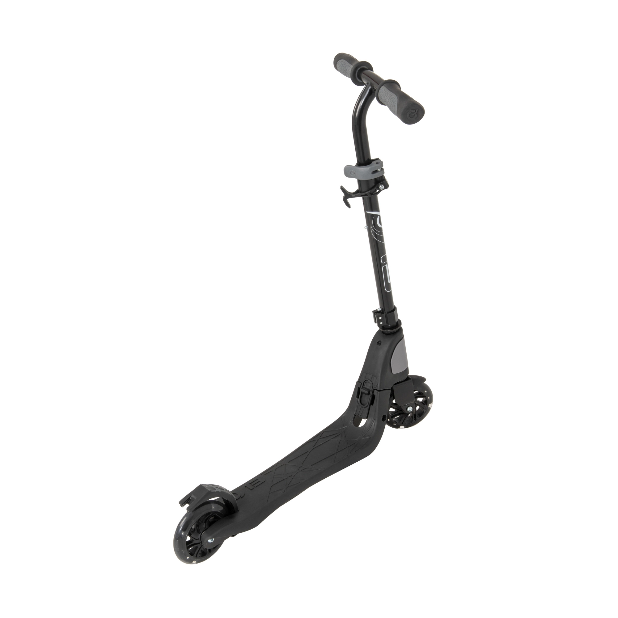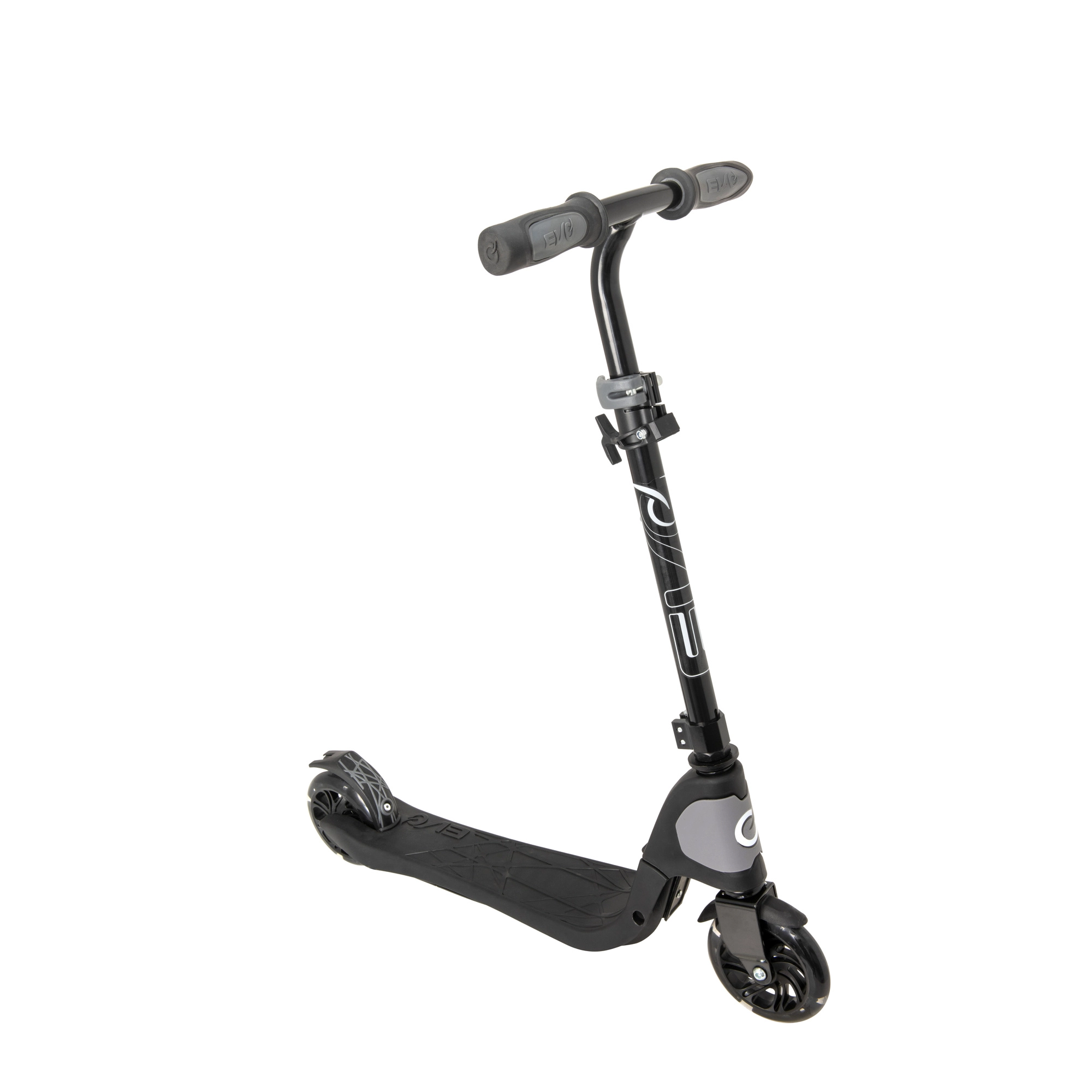 Chiusura rapida per il trasporto o il riponimento. La superficie antiscivolo della pedana con logo EVO aumenta stabilità e sicurezza nella spinta.