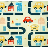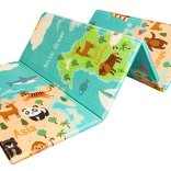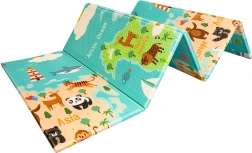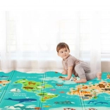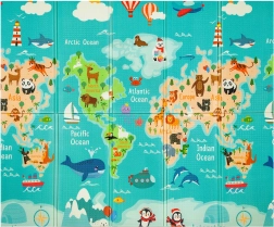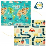 Un lato con la mappa del mondo colorata e gli animali, l’altro con città e strade per le macchinine. Due temi educativi in un unico tappetino che sviluppano fantasia e conoscenze.