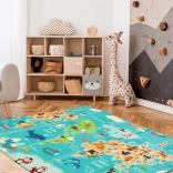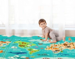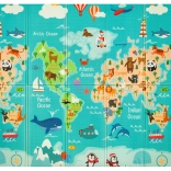Il design favorisce l’apprendimento attraverso il gioco: la mappa del mondo con oceani, continenti e animali stimola la curiosità per la geografia, mentre le stradine con macchinine ed edifici alimentano fantasia e gioco creativo. Il tappetino è impermeabile e igienico: basta passarlo con un panno umido, non trattiene la polvere ed è adatto anche agli allergici.