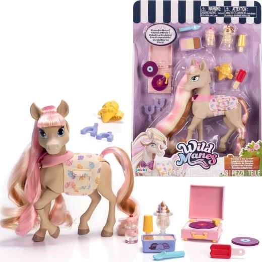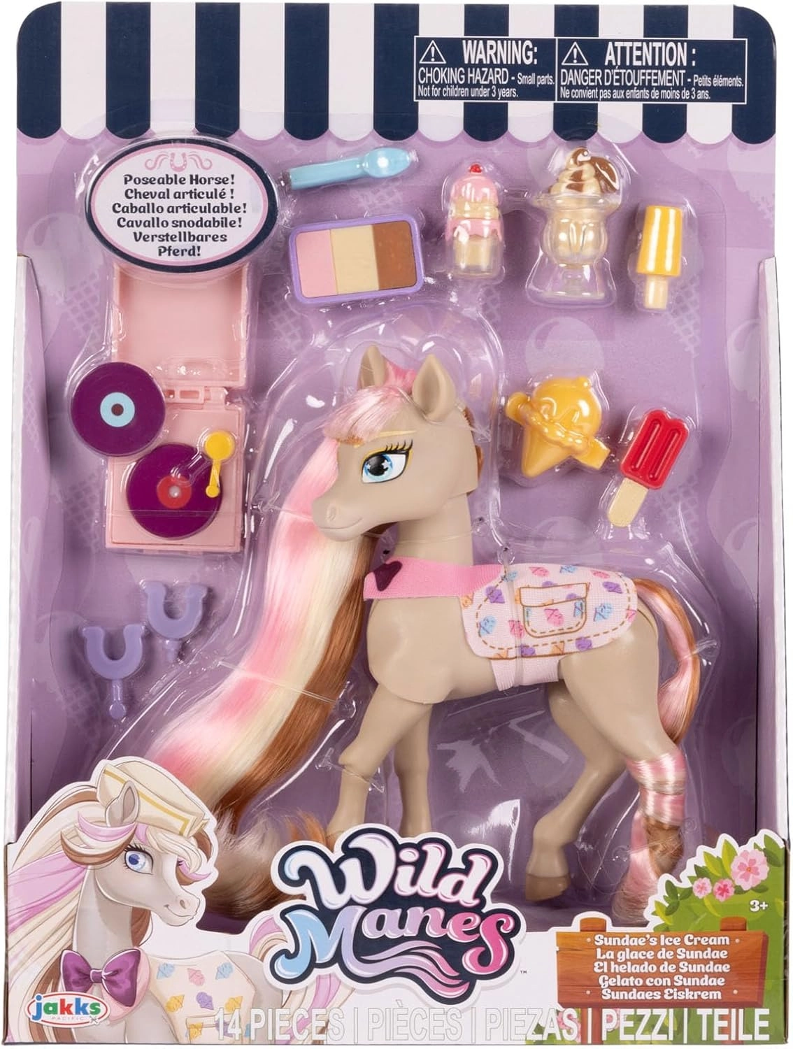 Il cavallo Sundae incanta con ciocche napoletane della criniera e colori pastello che evocano il mondo dei dolci. Grazie alle zampe anteriori snodabili realizza pose adorabili e “serve” delizie gelato. La lunga criniera invita al pettinare e decorare, mentre i divertenti accessori aprono le porte a infinite scenette della cittadina Mane Lane dalla serie WILD MANES.