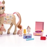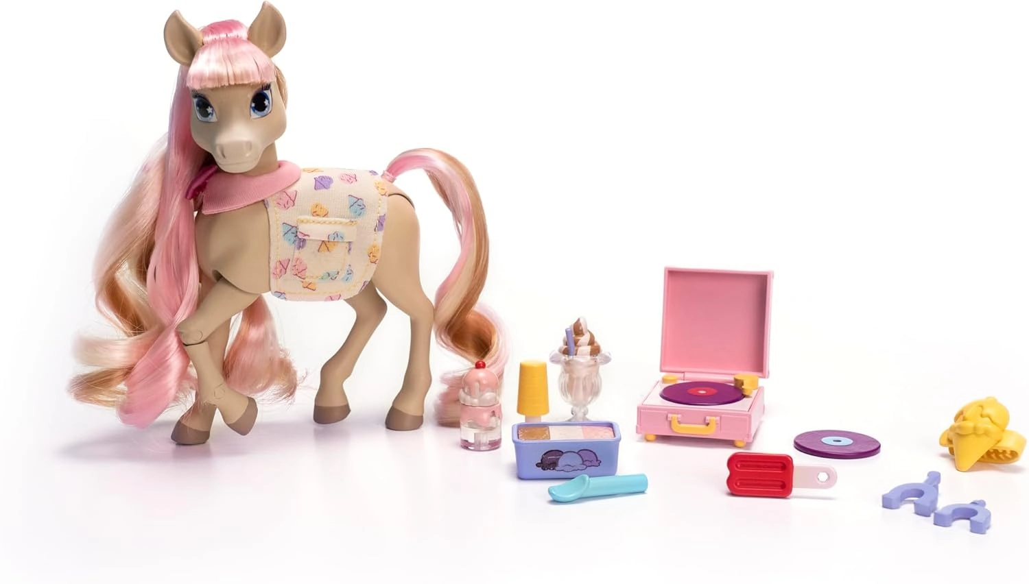 La lunga criniera colorata invita a essere pettinata e decorata con fermaglio e spazzola. Gli accessori per il gelato ispirano a creare storie dolci tutte proprie.
