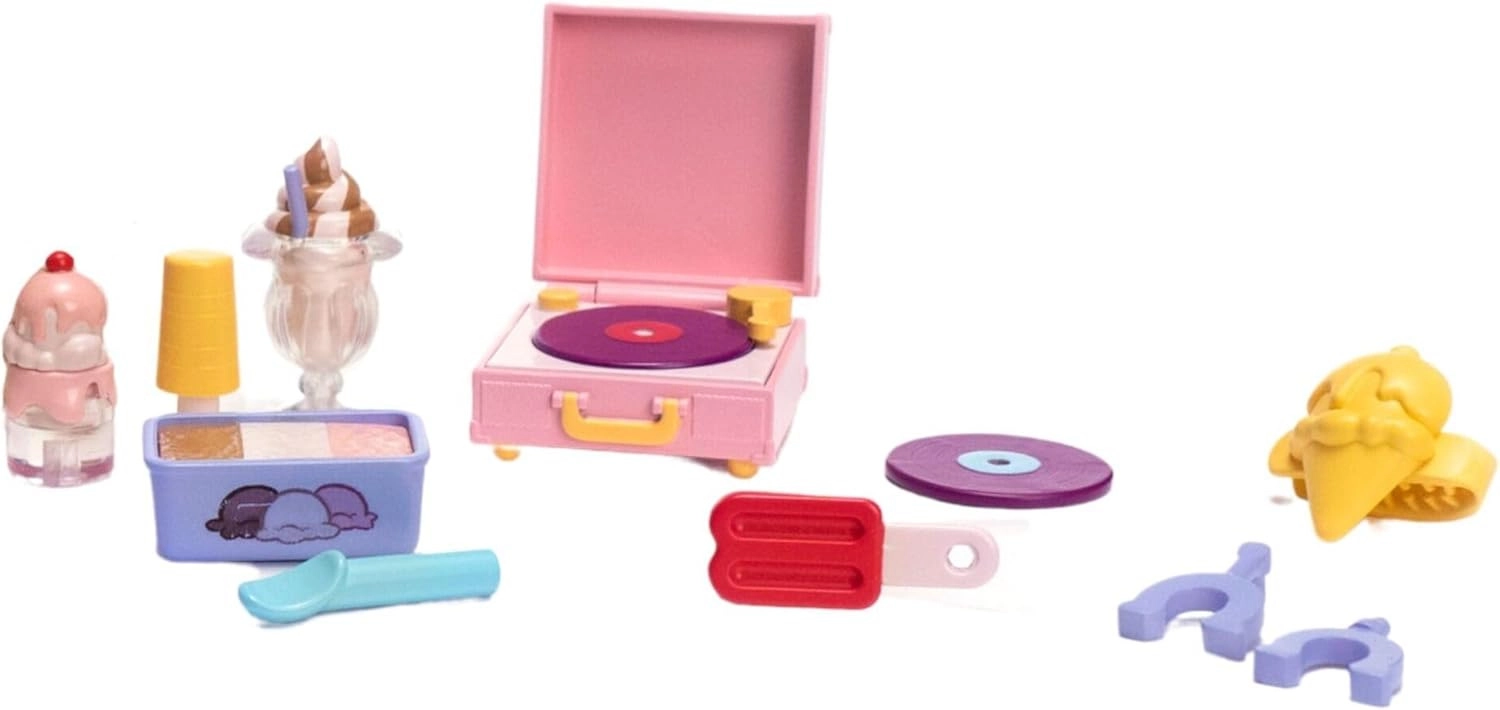 Il “giradischi” giocattolo, le piccole “dischi” e gli accessori per il gelato aggiungono atmosfera al gioco e dettagli che i bambini adorano.