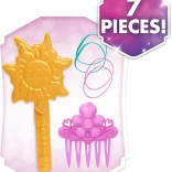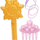 Spazzola a forma di sole, pettinino rosa ed elastici di vari colori per creare decine di acconciature originali.