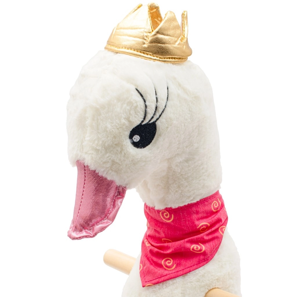 Questo elegante cigno bianco con dettagli rosa e coroncina dorata conquisterà piccole principesse e genitori. Il giocattolo è realizzato in materiale morbido e piacevole, mentre la base in legno con ruote consente di passare facilmente tra dondolio e guida. La melodia integrata supporta lo sviluppo sensoriale e aggiunge una nuova dimensione al gioco.