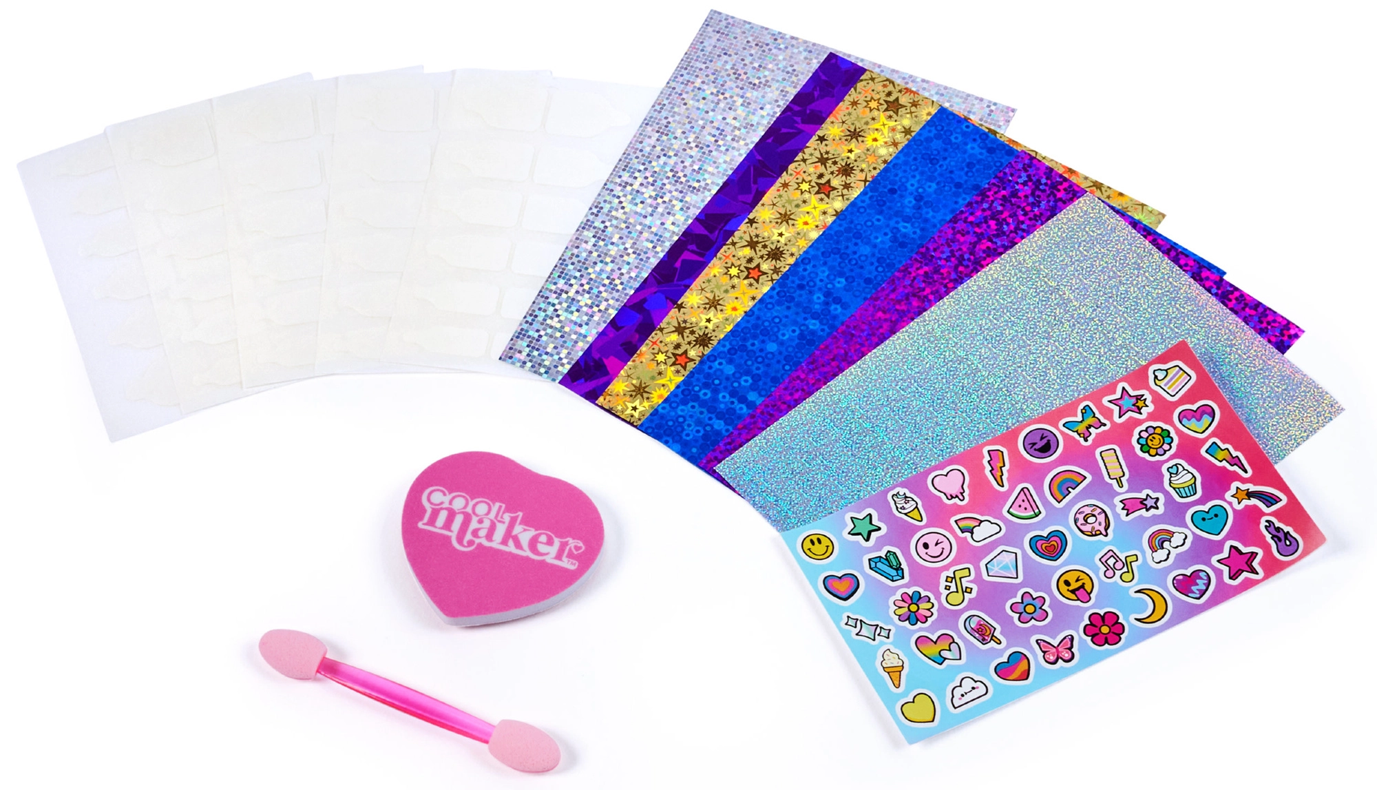 Accessorio creativo per piccole stiliste del marchio Spin Master: Cool Maker Mix & Mani è un piccolo set aggiuntivo per decorare le unghie che offre un'attività semplice e divertente. Basta posizionare la mascherina adesiva, premere il motivo scelto, applicare l'adesivo ed è fatto. I motivi possono essere cambiati facilmente e si può ricominciare da capo, garantendo un'infinita creatività.