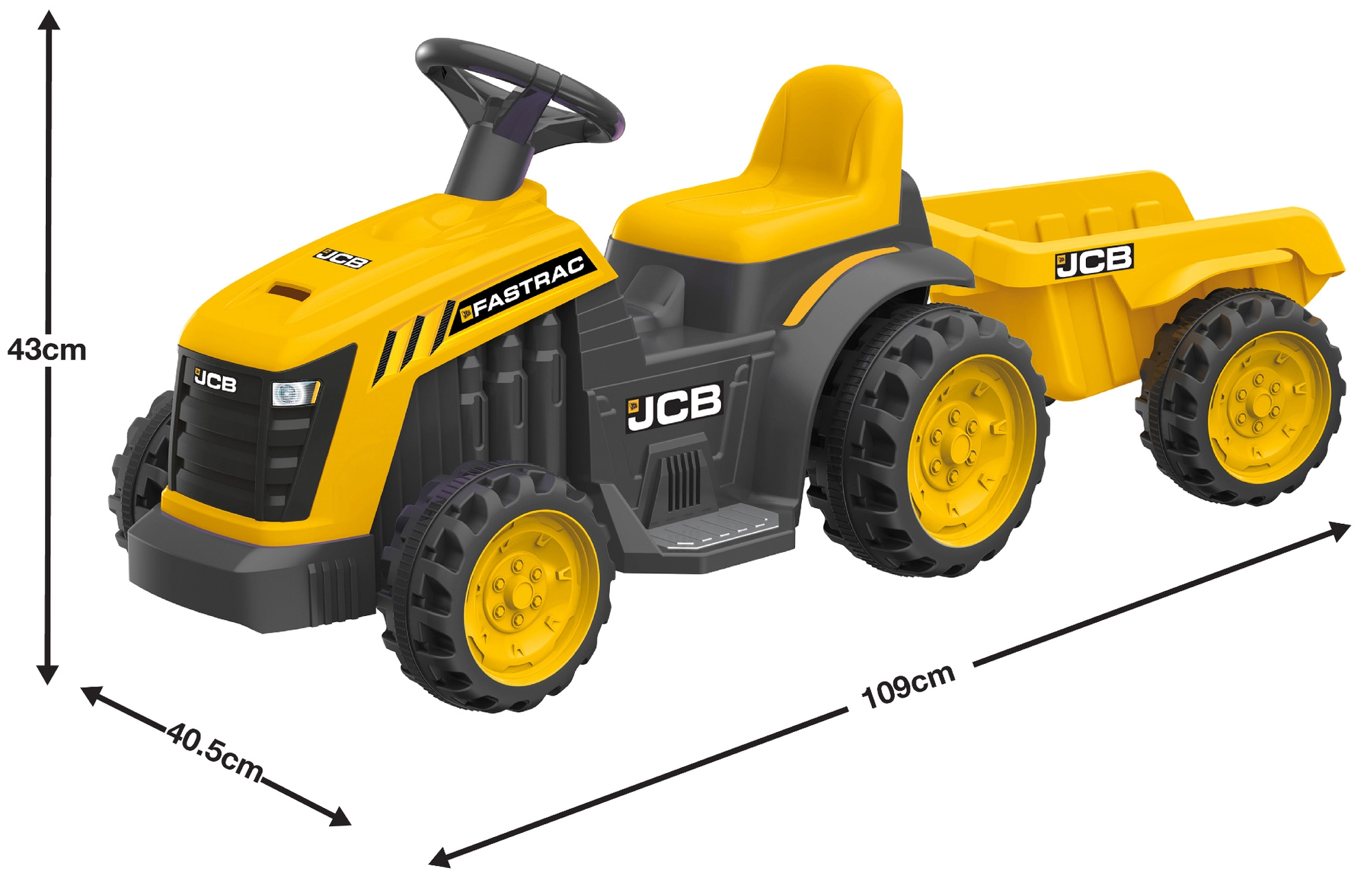 I piccoli agricoltori si divertiranno a caricare il rimorchio e a trasportare giocattoli o piccoli tesori. La struttura stabile a quattro ruote, i poggiapiedi antiscivolo e i materiali resistenti garantiscono una guida confortevole e una lunga durata. I comandi sono intuitivi – avvio con pulsante, marcia in avanti, sterzo con volante.