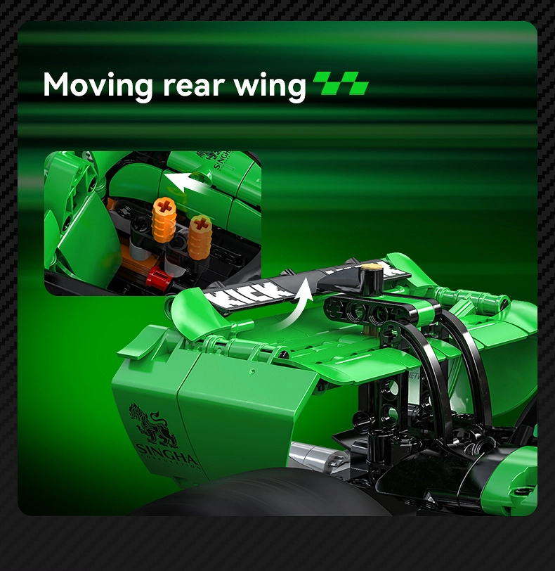 Questo set soddisferà gli appassionati di tecnica e i collezionisti. La monoposto F1, realizzata con grande precisione, riproduce fedelmente le forme aerodinamiche, il sistema Halo, il cockpit dettagliato e le vistose marcature sugli pneumatici Pirelli, tutto grazie alla stampa permanente dei pezzi senza necessità di adesivi. La struttura robusta e le fasi di montaggio studiate garantiscono un coinvolgente piacere di costruzione.